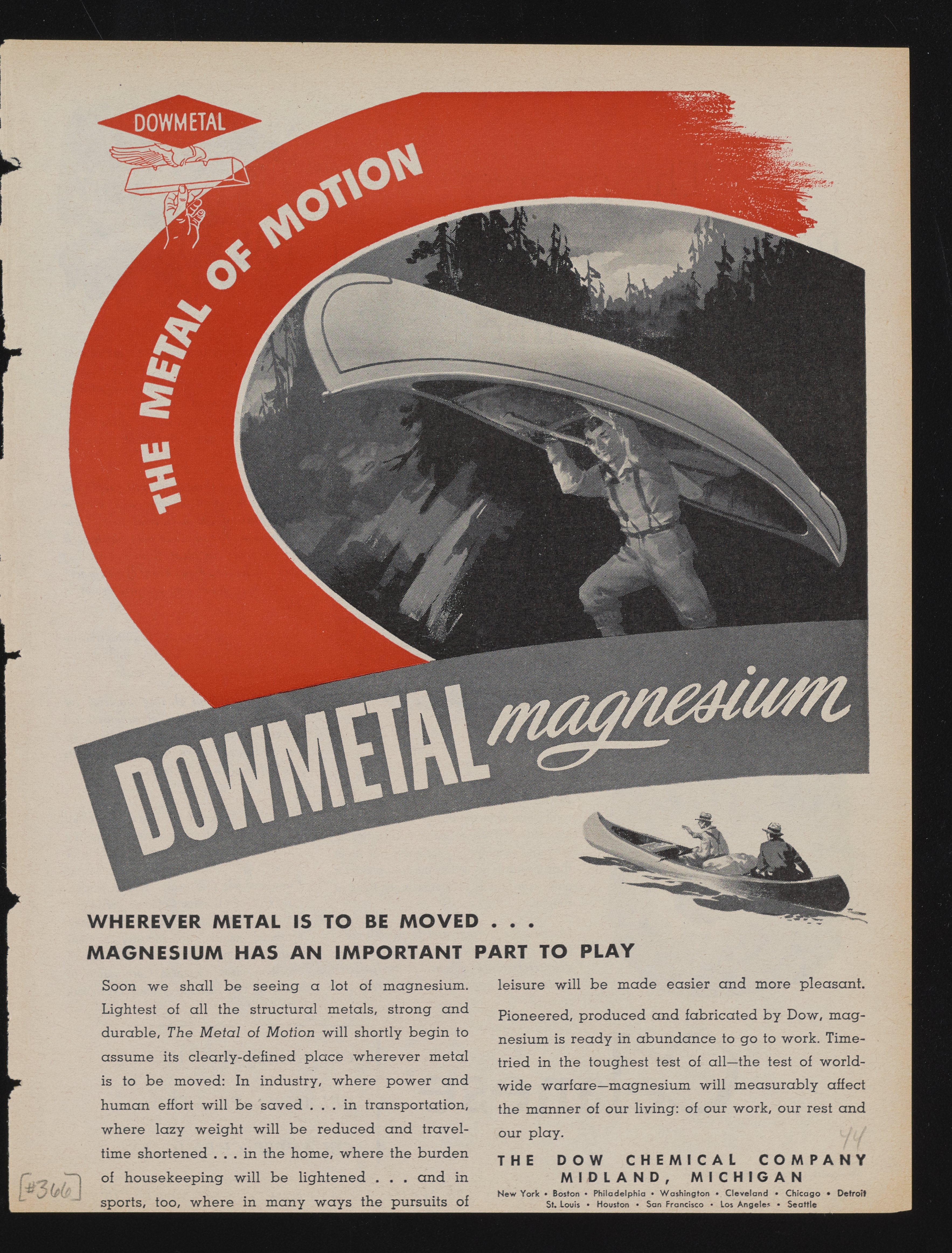 Dow Chemical Company. “Dowmetal Magnesium: The Metal of Motion,” 1944. Advertisements from the Dow Chemical Historical Collection, Box 8. Science History Institute. Philadelphia. https://digital.sciencehistory.org/works/ile9idk.