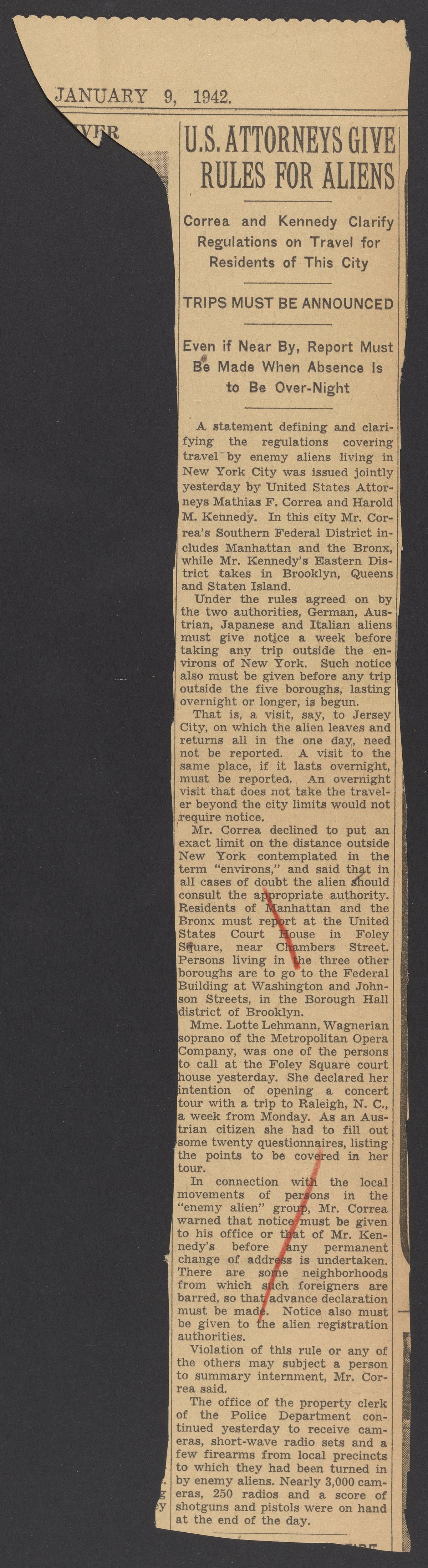 “U.S. Attorneys Give Rules for Aliens.” New York, New York: New York times, January 9, 1942. Papers of Georg and Max Bredig, Box 10, Folder 26. Science History Institute. Philadelphia. https://digital.sciencehistory.org/works/iljrjaq.