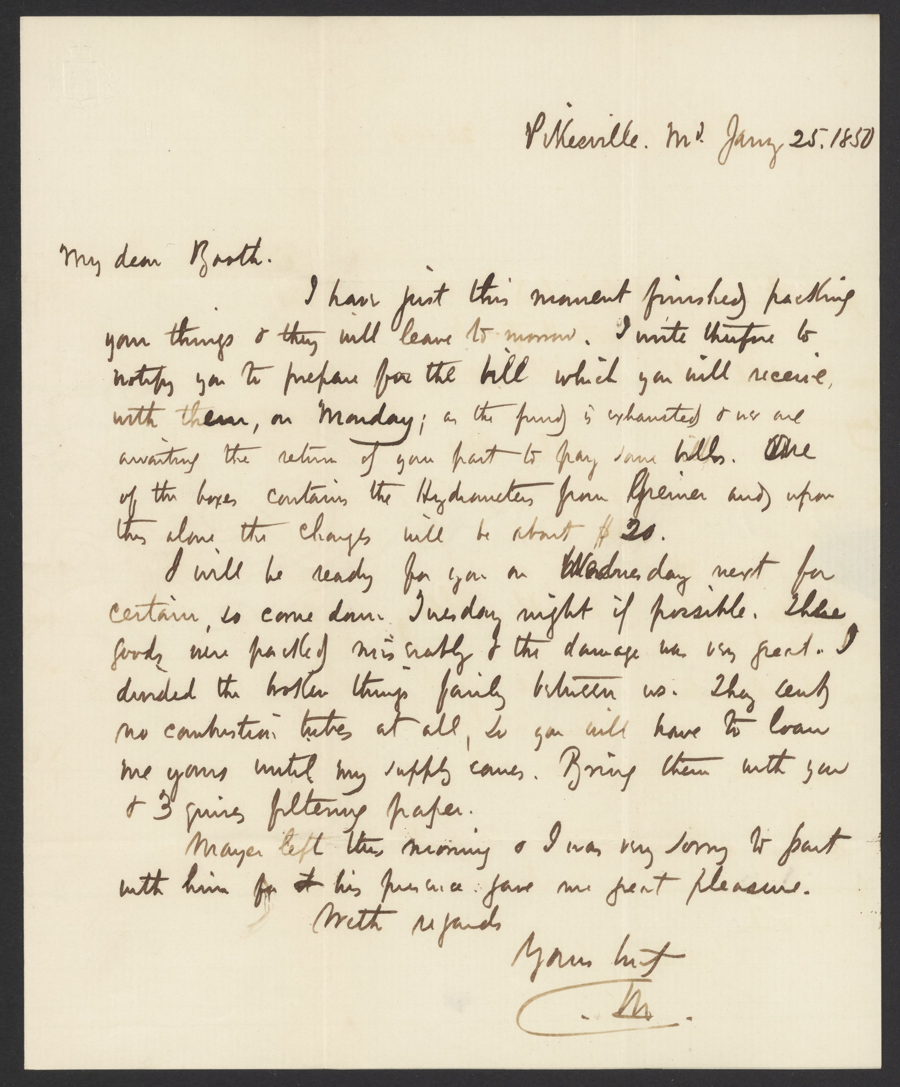 Letter from Campbell Morfit to James Curtis Booth, January 25, 1850