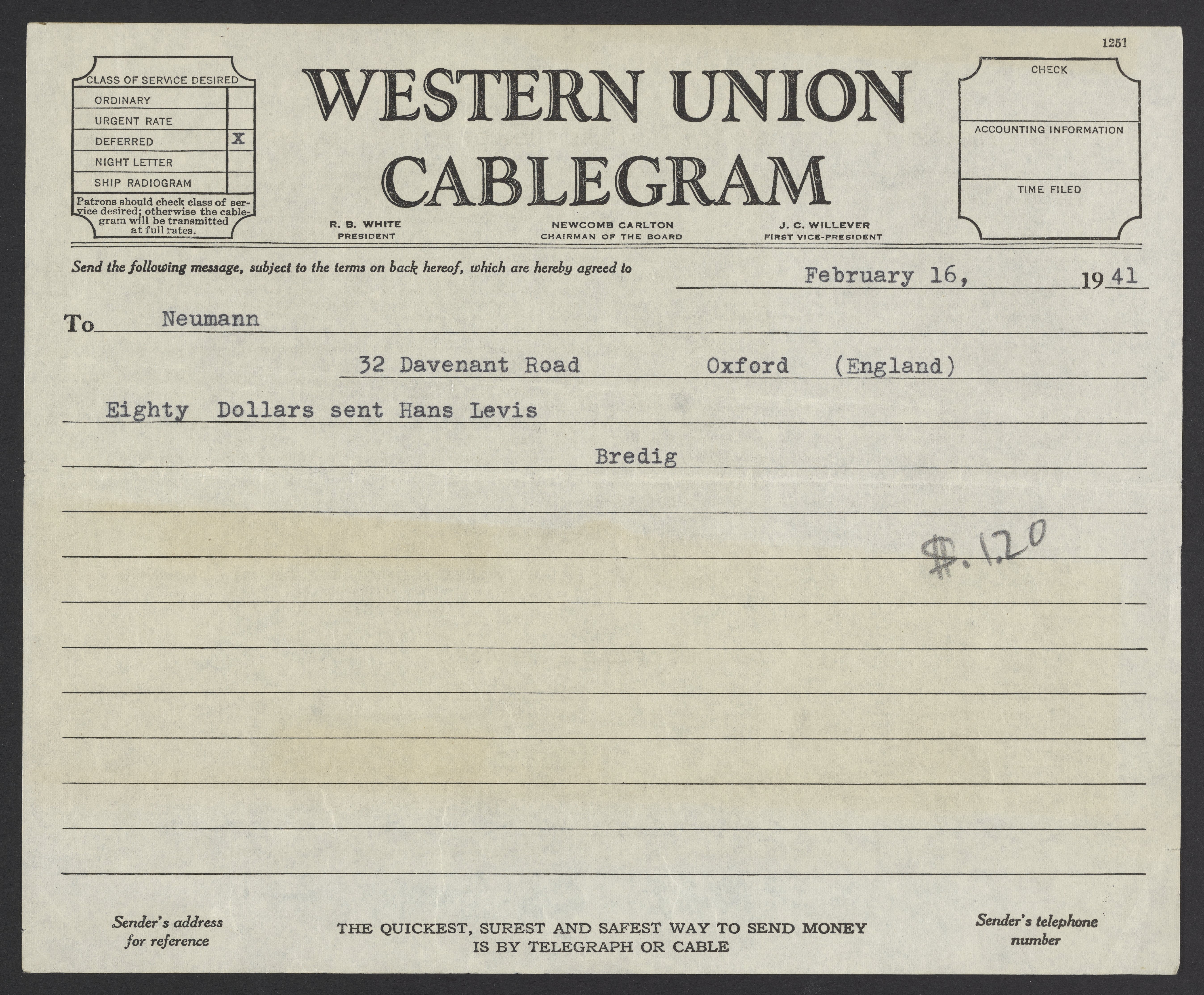 Telegram from Max Bredig to Elisabeth Neumann, February 16, 1941