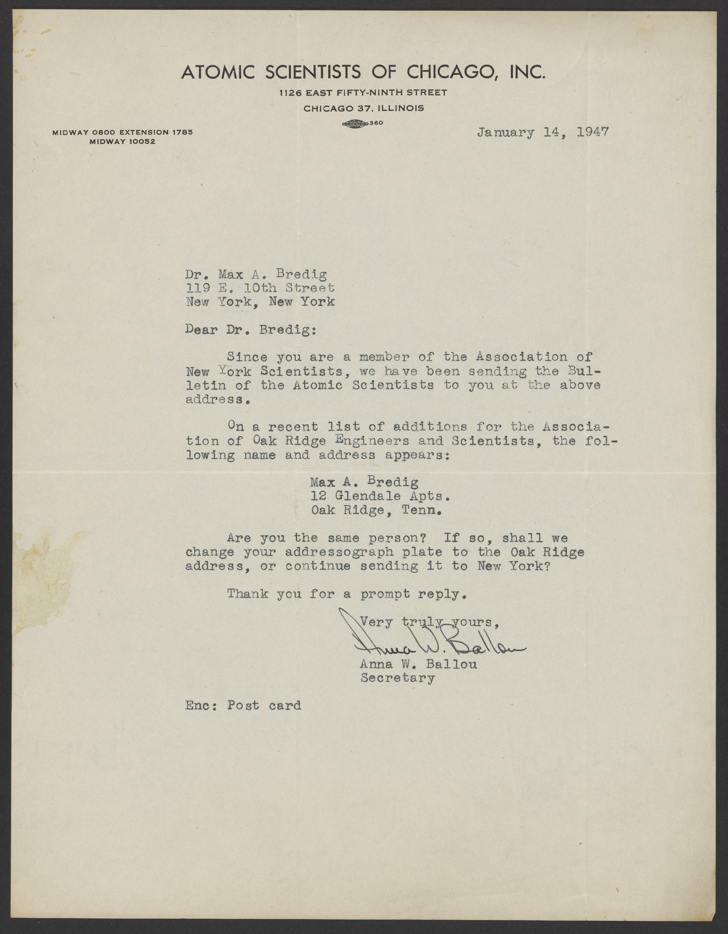 Ballou, Anna W. “Letter to Max Bredig from Anna W. Ballou on Behalf of the Atomic Scientists of Chicago, Inc.,” January 14, 1947. Papers of Georg and Max Bredig, Box 10, Folder 3. Science History Institute. Philadelphia. https://digital.sciencehistory.org/works/imsbqov.