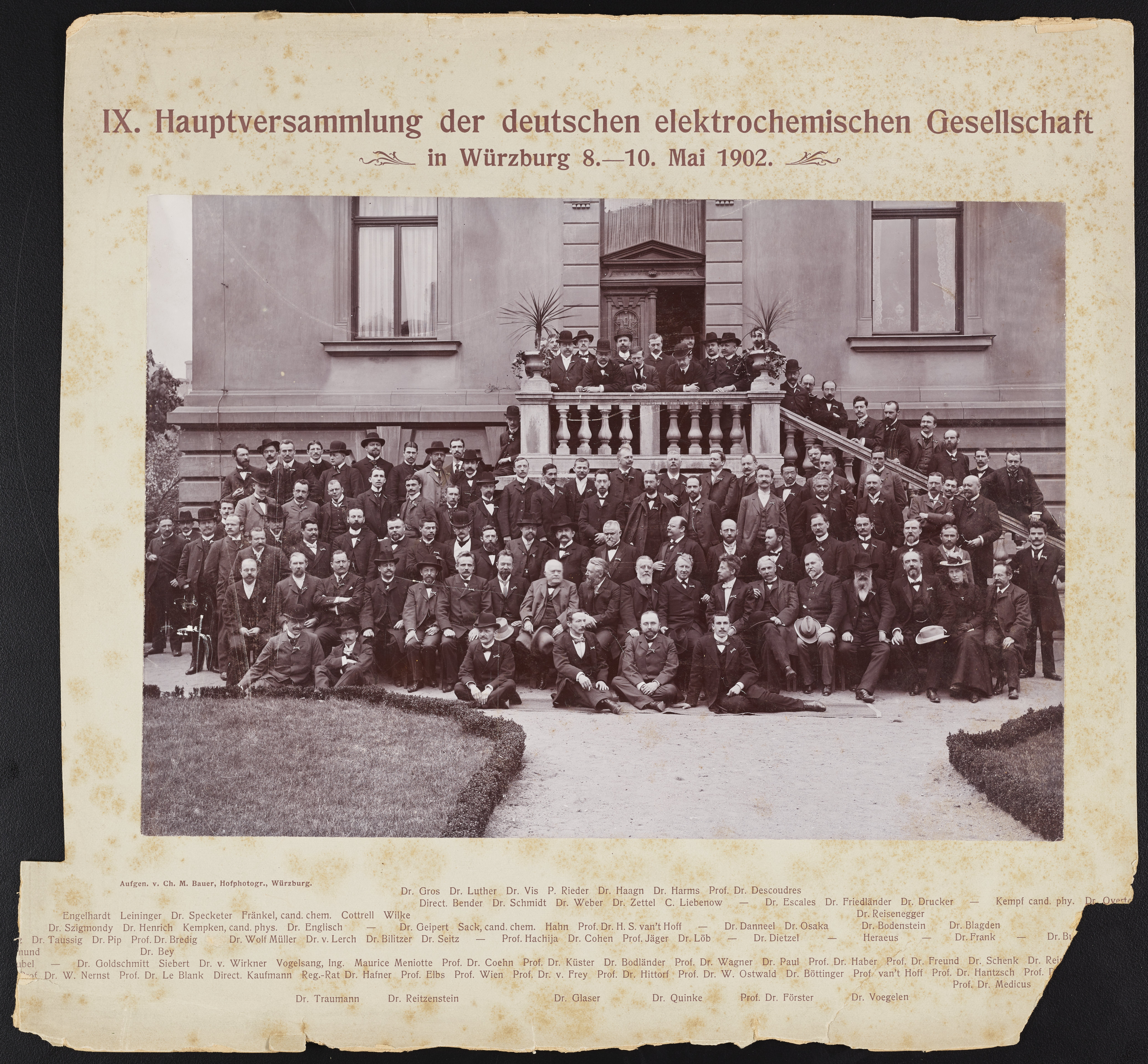 Small JPG1200 x 1112px — 292 KBLarge JPG2880 x 2669px — 1.5 MBFull-sized JPG8286 x 7679px — 9.9 MBOriginal fileTIFF — 8286 x 7679px — 182 MBPhotograph of the 1902 general meeting of the German Electrochemical Society held in Würzburg, Germany. In 1902 the name of the society changed to Deutsche Bunsen-Gesellschaft für Physikalische Chemie (German Bunsen Society for Physical Chemistry).