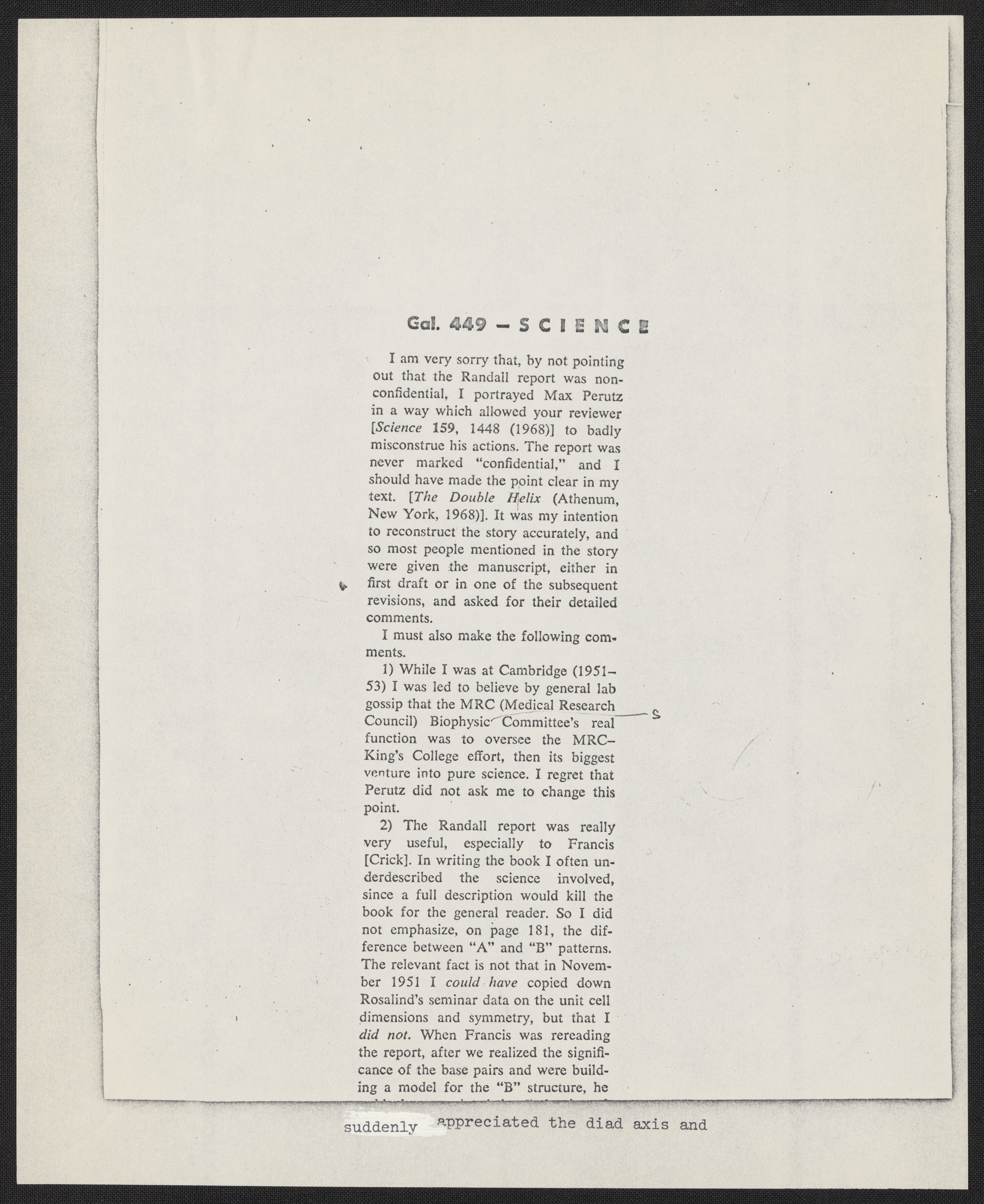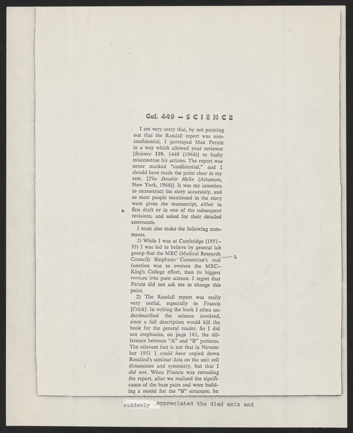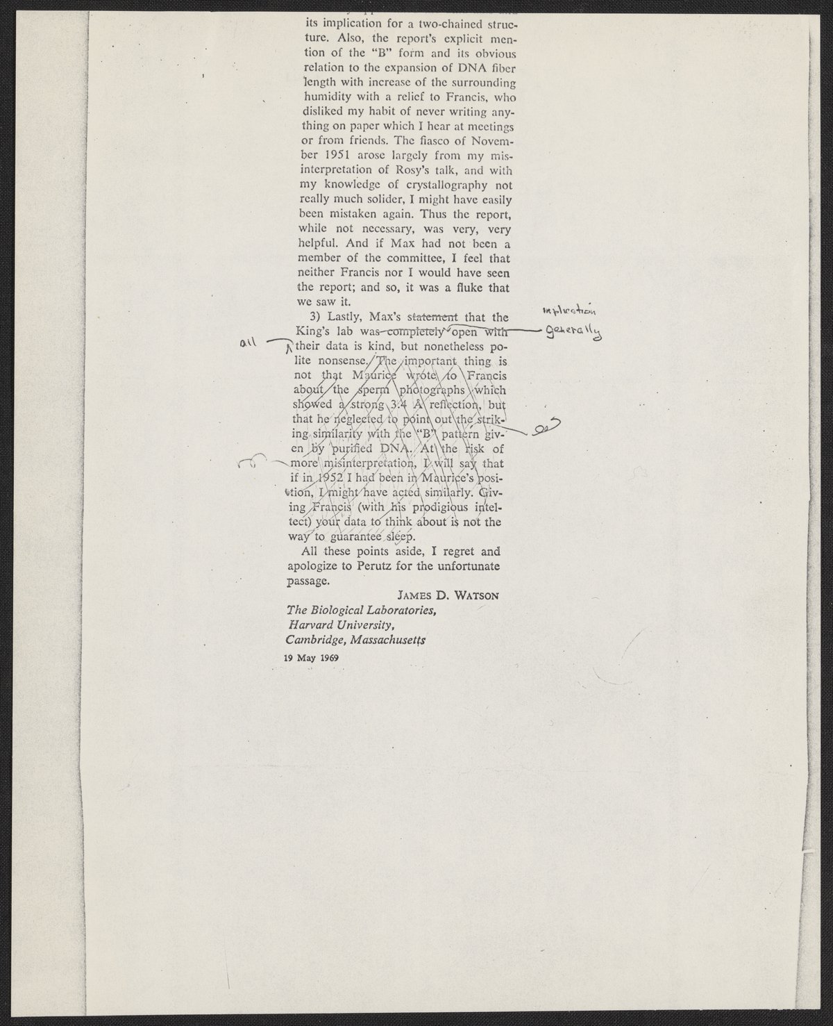 Watson, James D. “Letter to the Editor Written by Maurice Wilkins, May 19, 1969,” May 19, 1969. History of Molecular Biology Collection, Box 88, Folder 4. Science History Institute. Philadelphia. https://digital.sciencehistory.org/works/ine0enn.