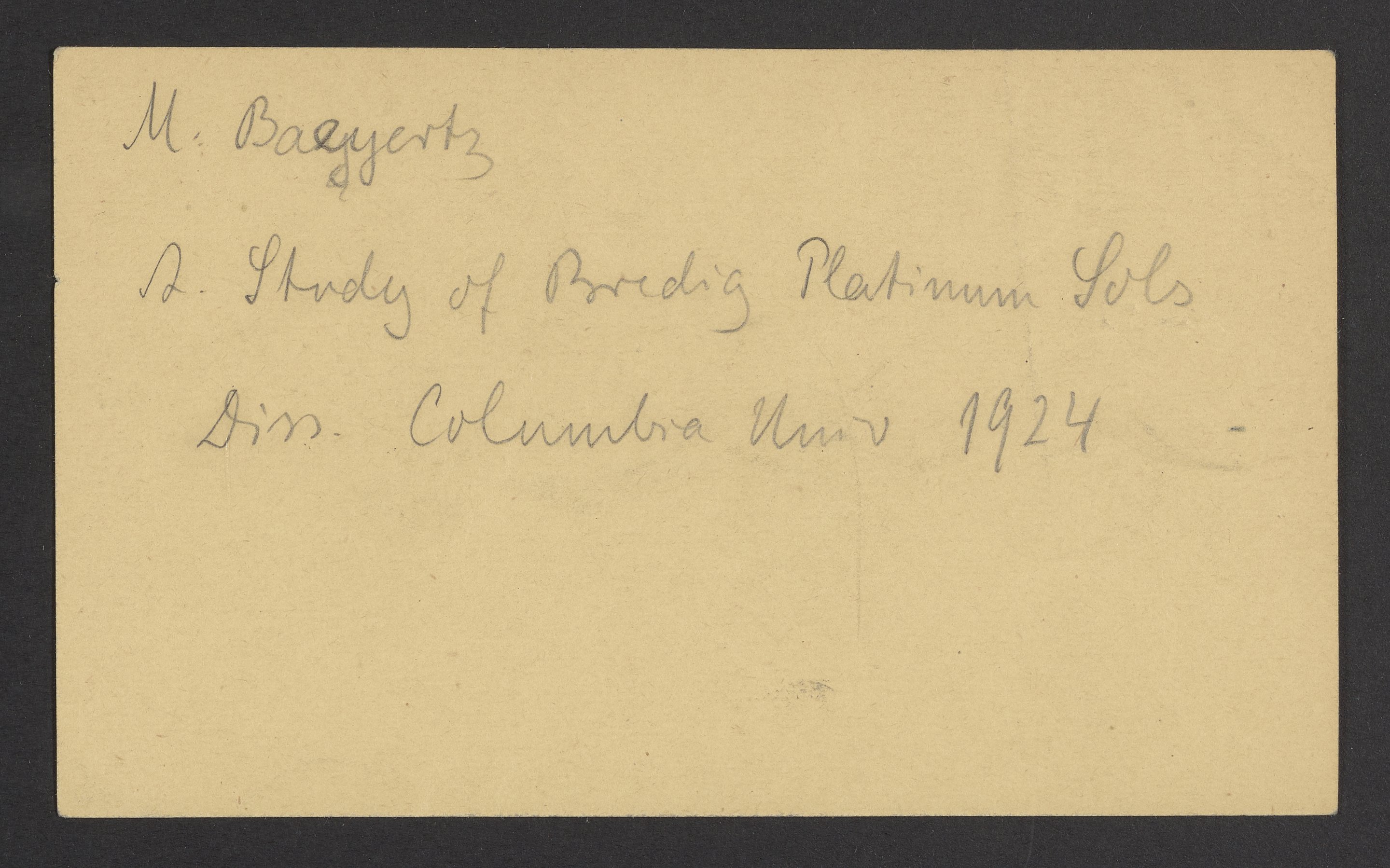 Small JPG1200 x 747px — 134 KBLarge JPG2880 x 1793px — 777 KBFull-sized JPG3243 x 2019px — 968 KBOriginal fileTIFF — 3243 x 2019px — 18.8 MBCatalog card from the Library of the Dresden Gehe-Foundation. The front of the card has printed "Library of the Dresden Gehe-Foundation, Annual Report, and System and Alphabetical Directory. Publisher: Zahn & Jaensch, Dresden". The title of a dissertation, A Study of Bredig Platinum Sols (1943) by Joseph Mindel (1912-2002) is handwritten on the back of the card. The dissertation concerns Georg Bredig's (1868-1944) work studying the formation of metallic hydrosols by the action of the direct current arc under