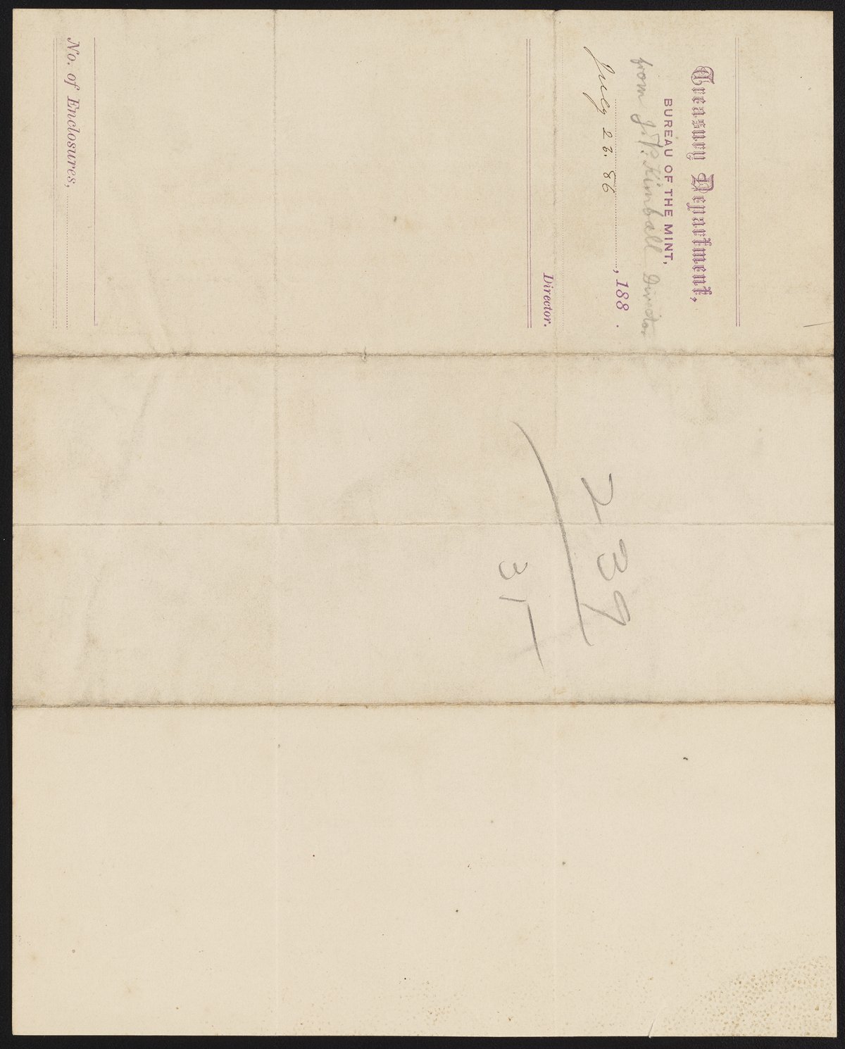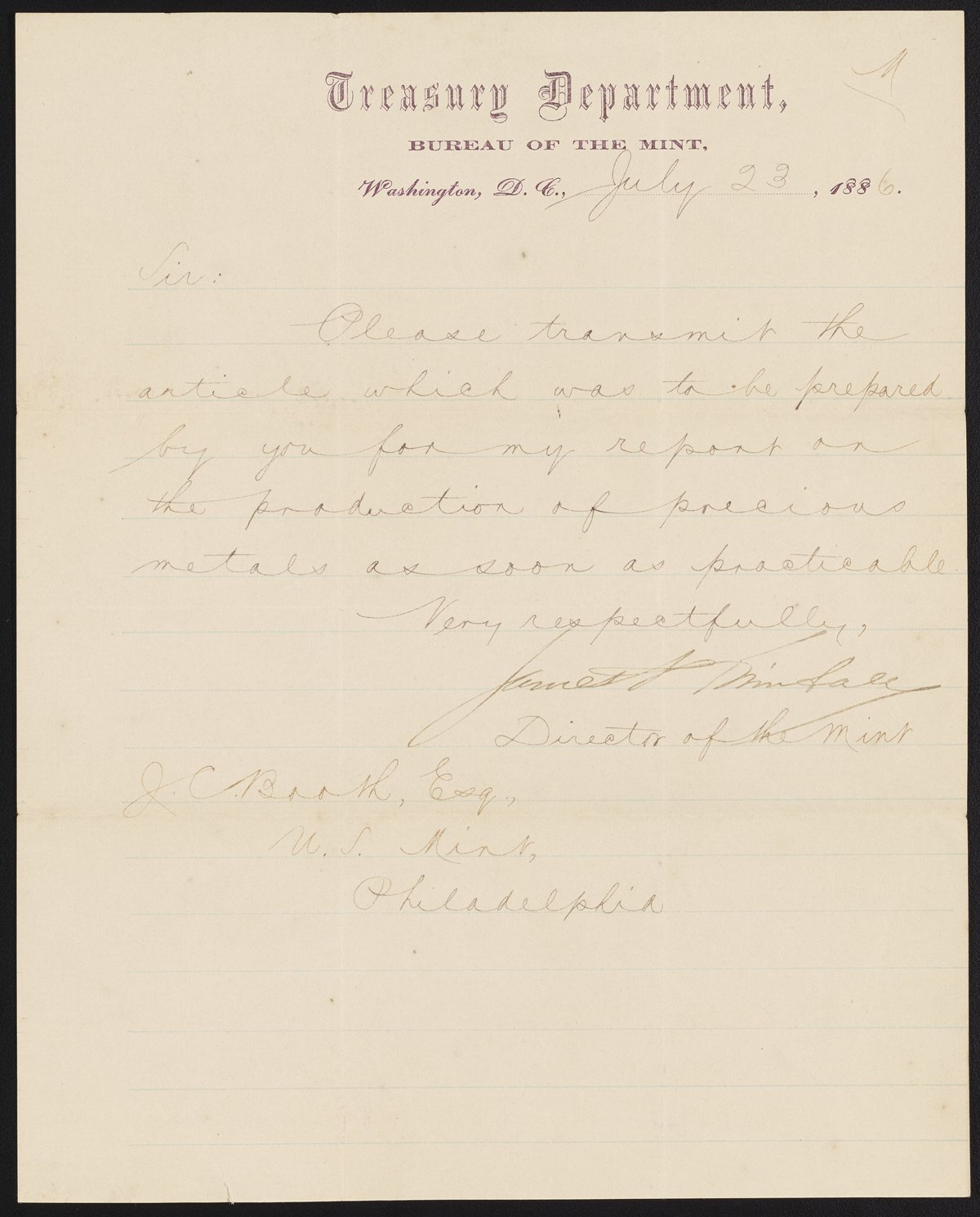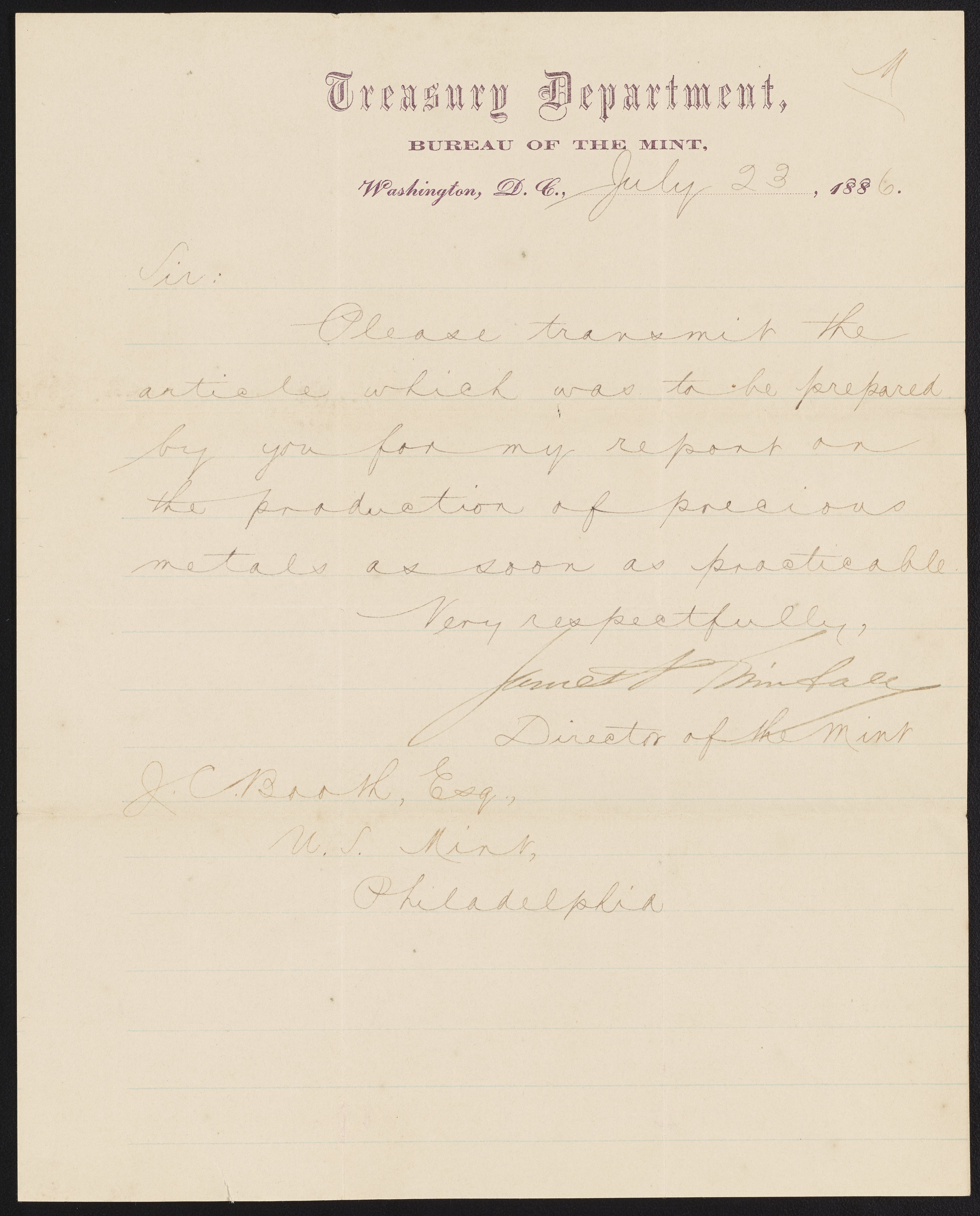 Small JPG1200 x 1489px — 169 KBLarge JPG2880 x 3574px — 1.1 MBFull-sized JPG4724 x 5863px — 3.2 MBOriginal fileTIFF — 4724 x 5863px — 79.3 MBJames P. Kimball (1836-1913), metallurgist and geologist and Director of the United States Mint from 1885-1889, requests James Curtis Booth (1810-1888) forward his article as quickly as possible.