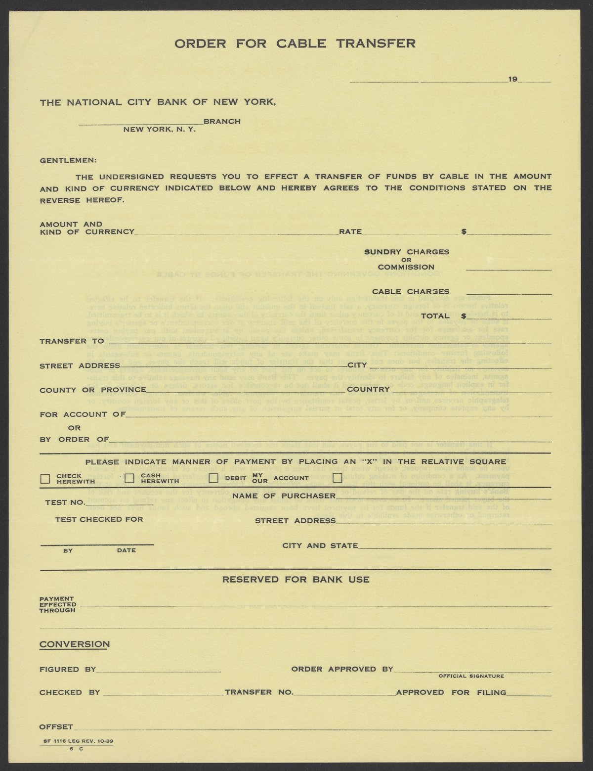 Small JPG1200 x 1559px — 246 KBLarge JPG2880 x 3742px — 1.5 MBFull-sized JPG5284 x 6865px — 5.2 MBOriginal fileTIFF — 5284 x 6865px — 104 MBBlank order form for the request of a money transfer via cable.