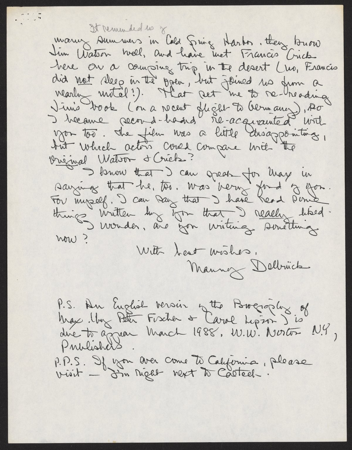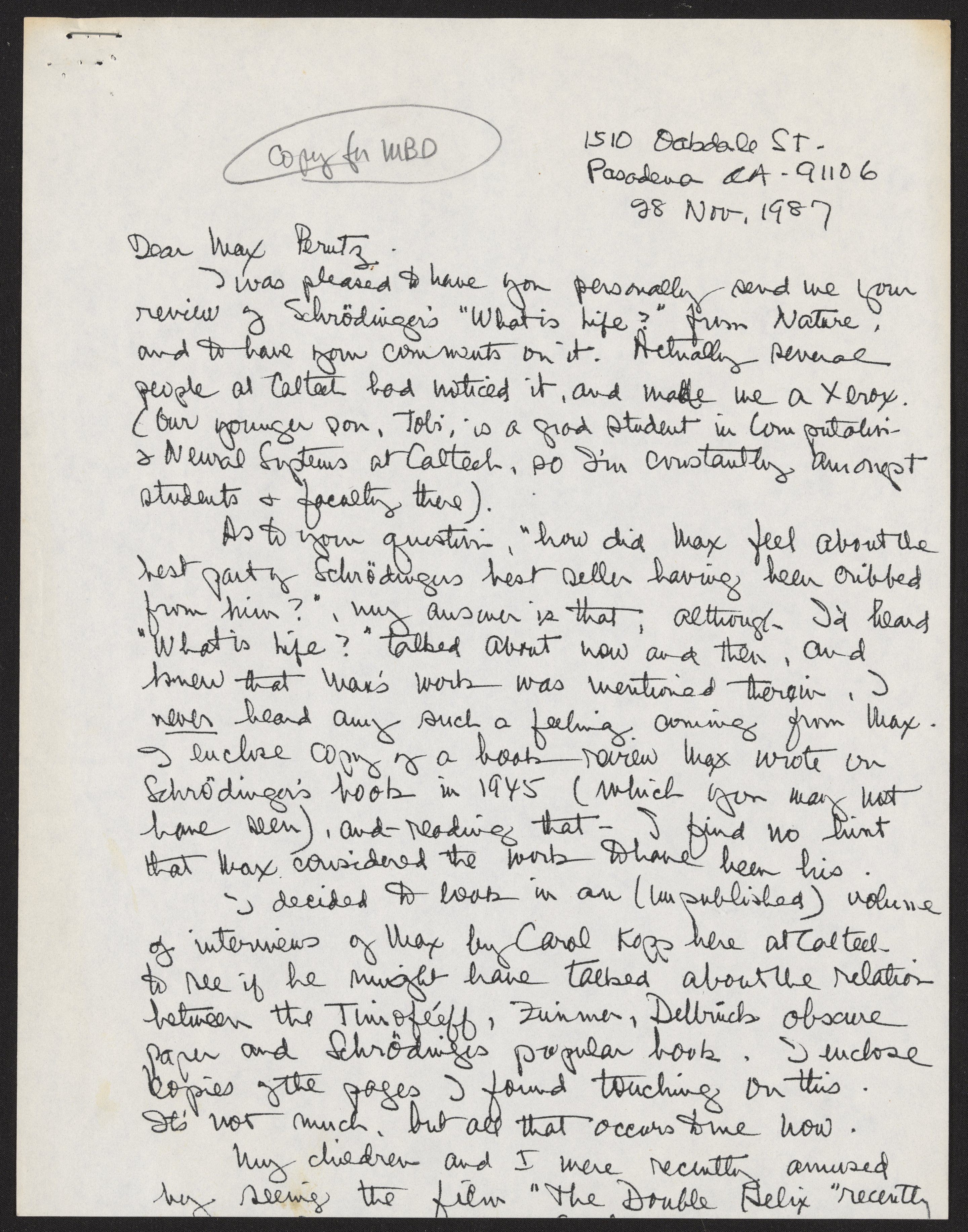Letter from Max Delbrück to Max Perutz, November 28, 1987