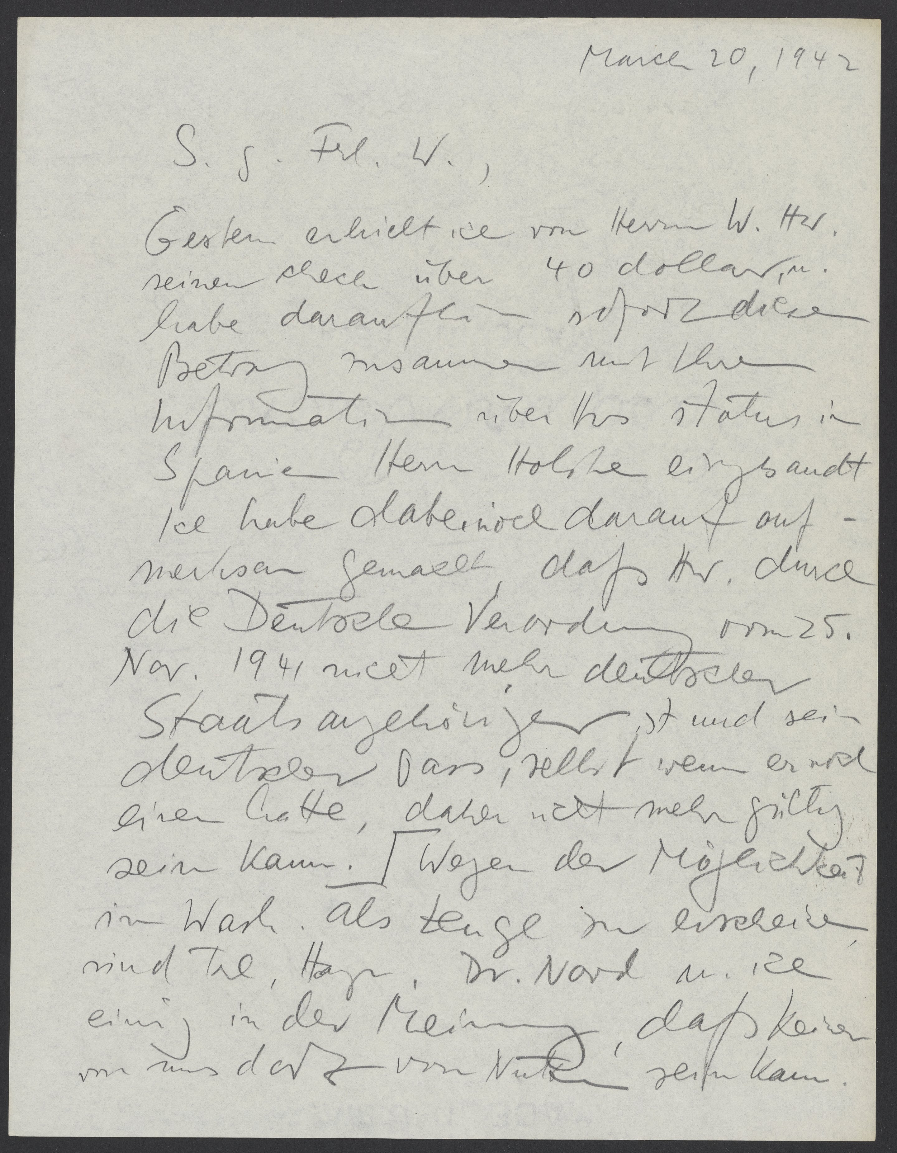 Letter from Max Bredig to Ilse Wolfsberg, March 20, 1942