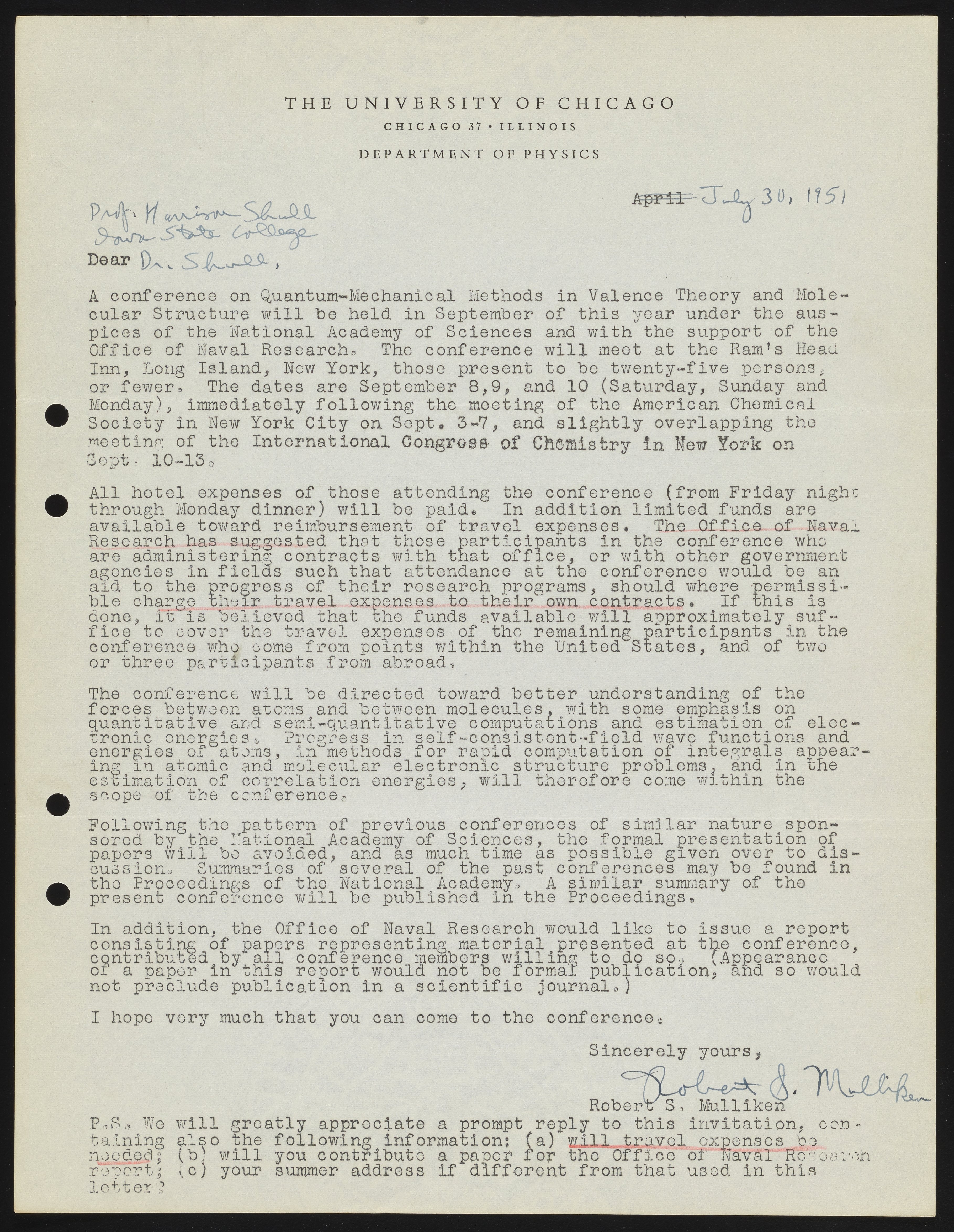 Mulliken, Robert Sanderson. “Letter from Robert S. Mulliken to Harrison Shull, 1951,” July 30, 1951. Robert S. Mulliken & Harrison Shull Correspondence, Box 1. Science History Institute. Philadelphia. https://digital.sciencehistory.org/works/j098zb16c.