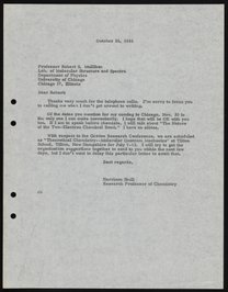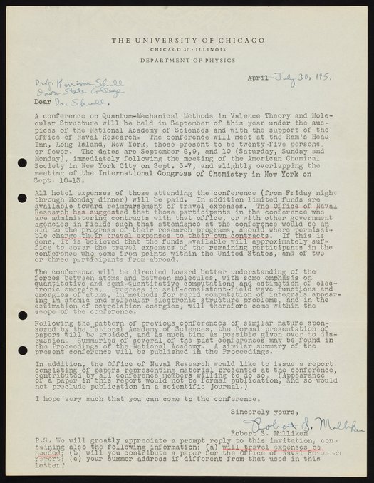 Mulliken, Robert Sanderson. “Letter from Robert S. Mulliken to Harrison Shull, 1951,” July 30, 1951. Robert S. Mulliken & Harrison Shull Correspondence, Box 1. Science History Institute. Philadelphia. https://digital.sciencehistory.org/works/j098zb16c.