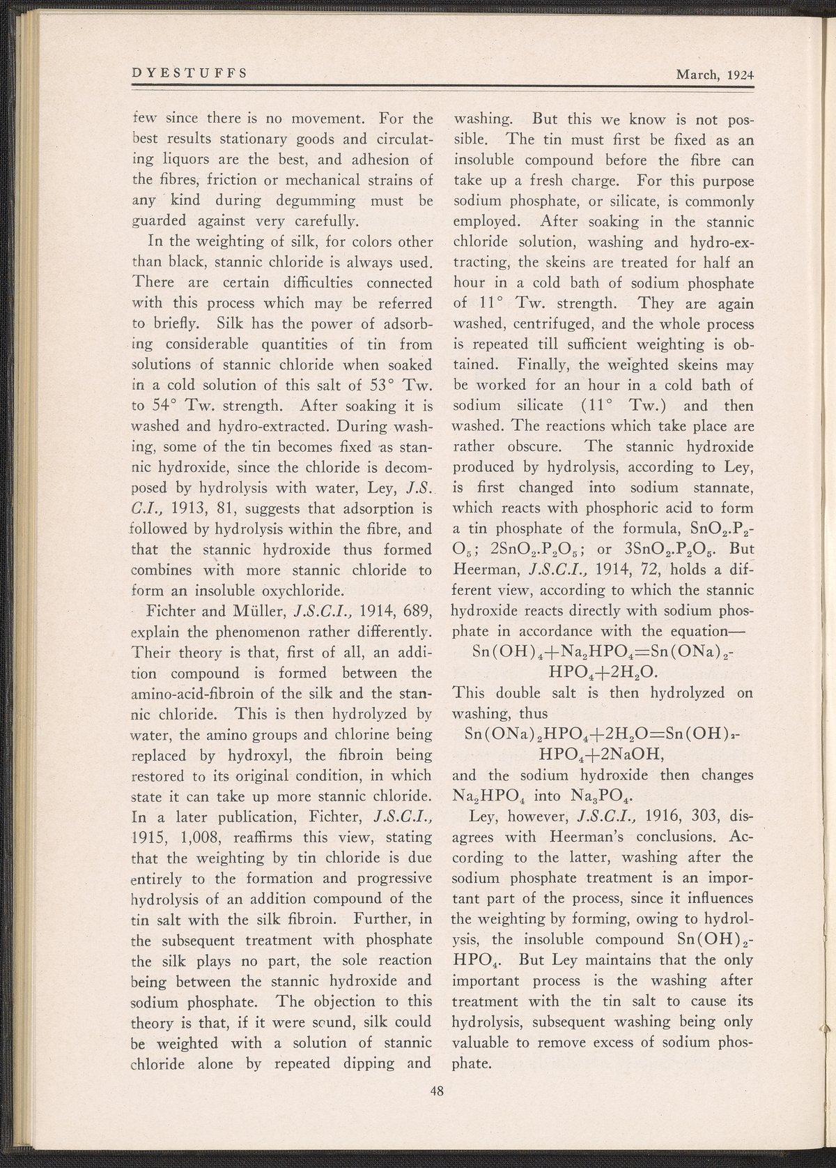 The journal contains reprints of select articles from periodicals in the dyeing and textile fields. This issue contains articles such as Dyeing of Sweater Yarn by Louis J. Matos; Some Difficulties Connected with the Weighting and Dyeing of Skein Silk by S. R. Trotman from The Textile Recorder; Dyeing of Bolivias, Velours, and Other Napped and Pile Fabrics from Fibre and Fabric; Coloring Chrome Suede Stock; and Determining Money Value in Dyes for Paper by Leonard Mann. This issue includes black and white printed illustrations.