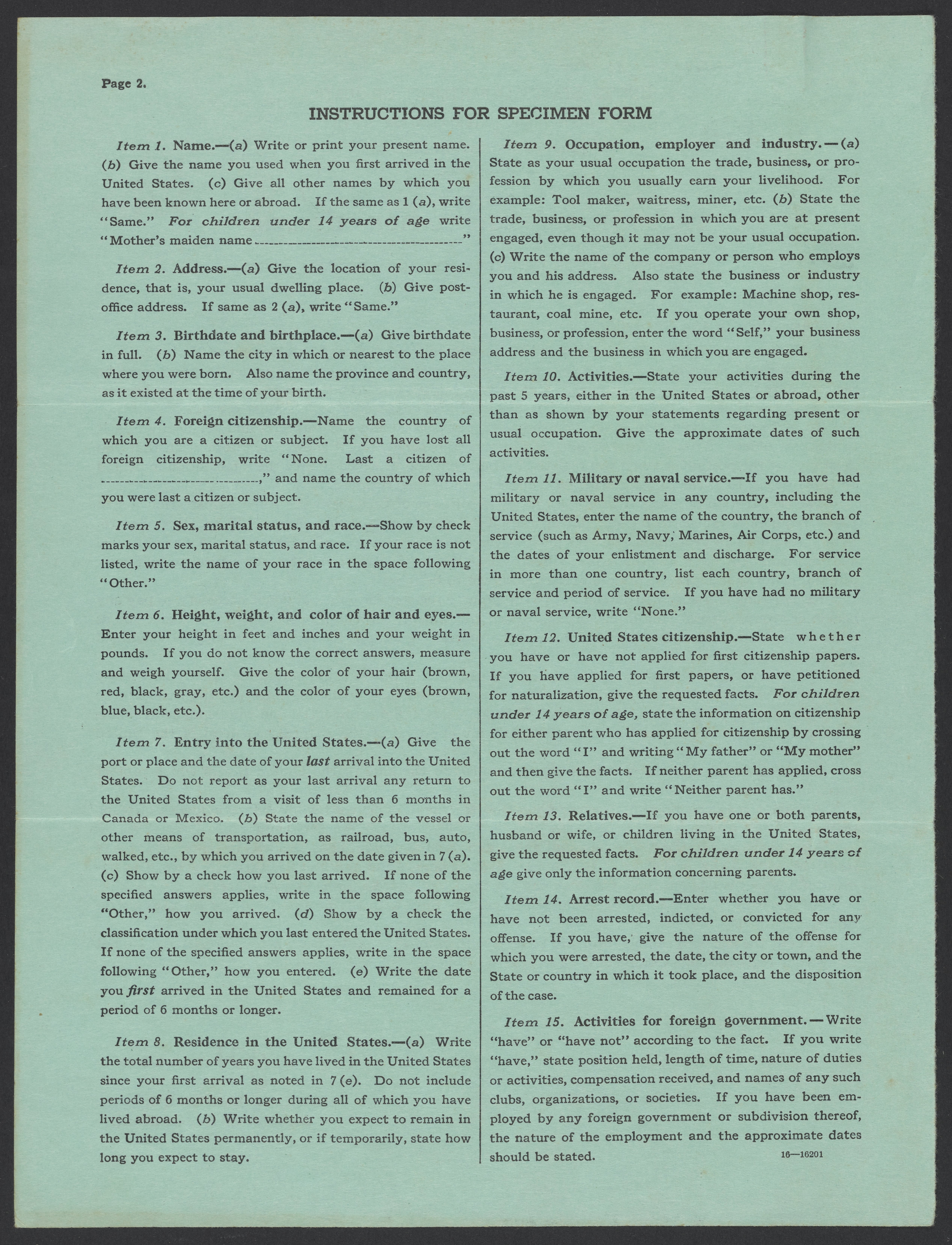 The National Registration of Aliens Instructions for Registration and Specimen Form