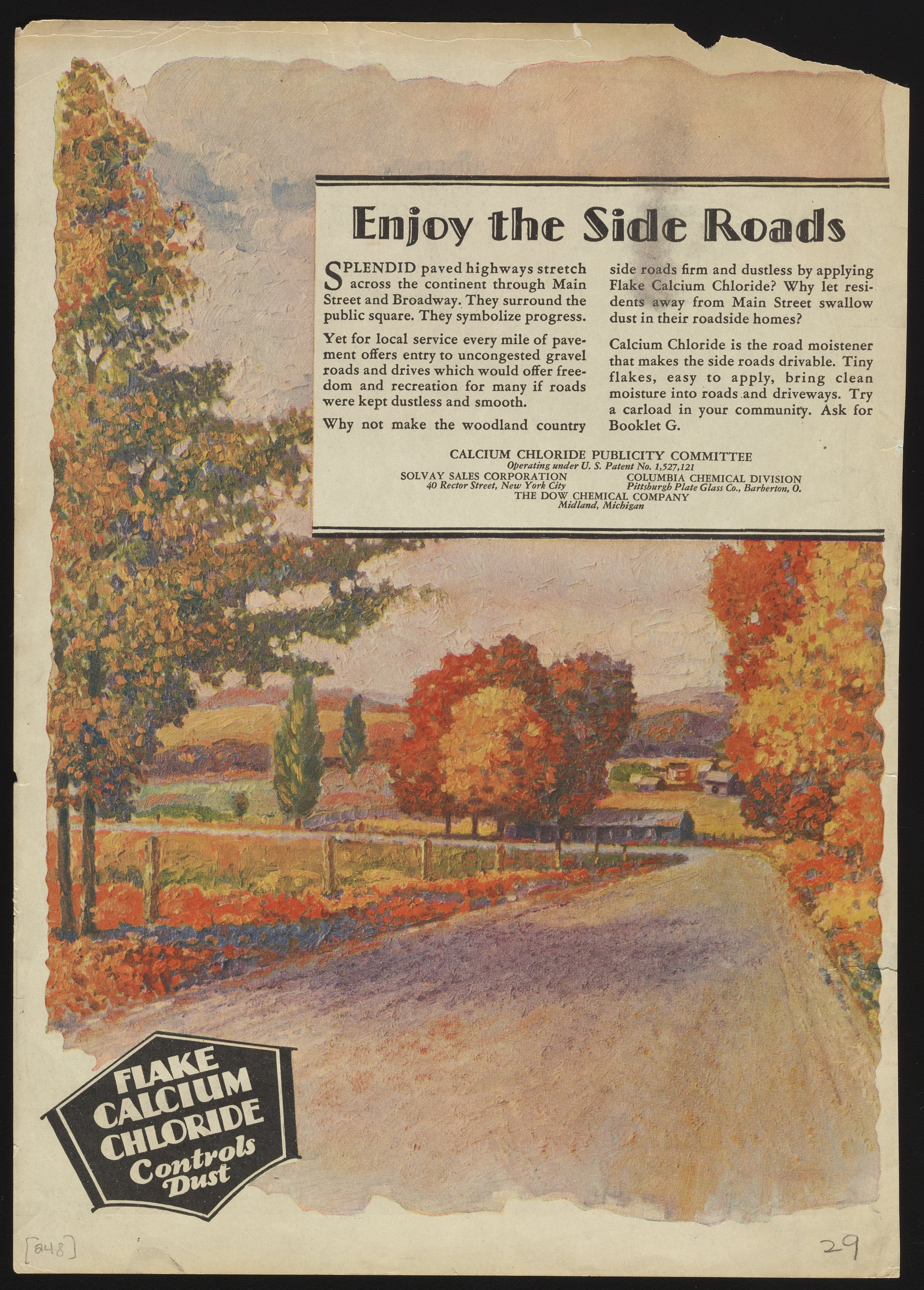 Advertisement for Dowflake Calcium Chloride, a product of the Dow Chemical Company, with view of a tree-lined, unpaved rural road. Patented on February 17, 1925, Dowflake was marketed for use to control dust on unpaved roads and parking lots, as well as a roadway deicer.