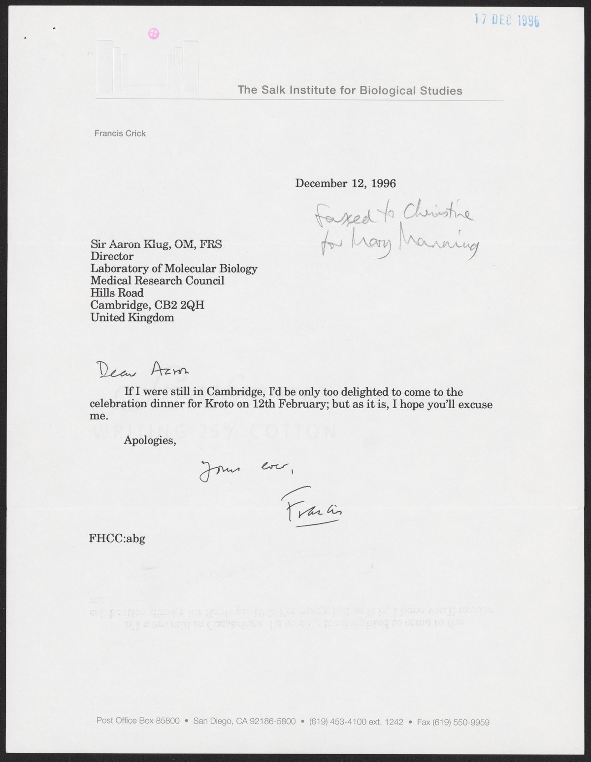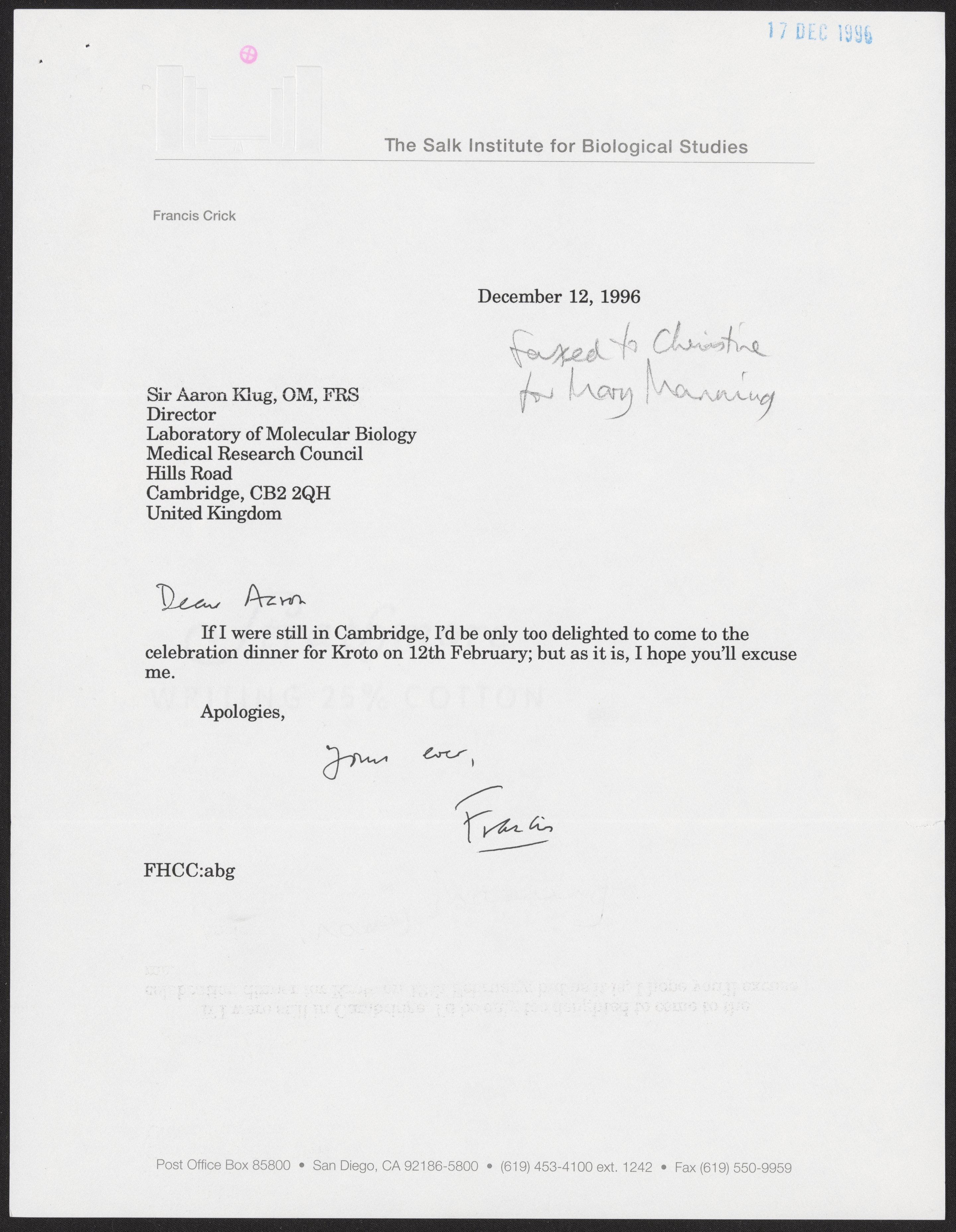 Letter from Francis Crick to Aaron Klug, December 12, 1996