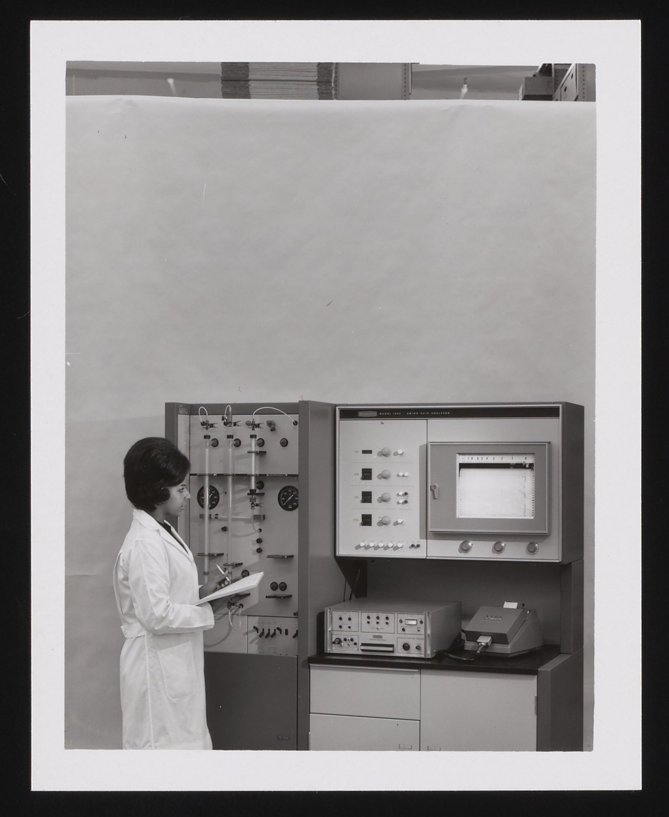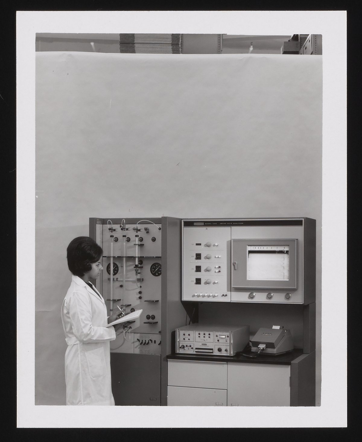 “Unidentified Woman Using a Beckman/Spinco Amino Acid Analyzer,” n.d. Beckman Historical Collection, Box 78. Science History Institute. Philadelphia. https://digital.sciencehistory.org/works/j67313881.