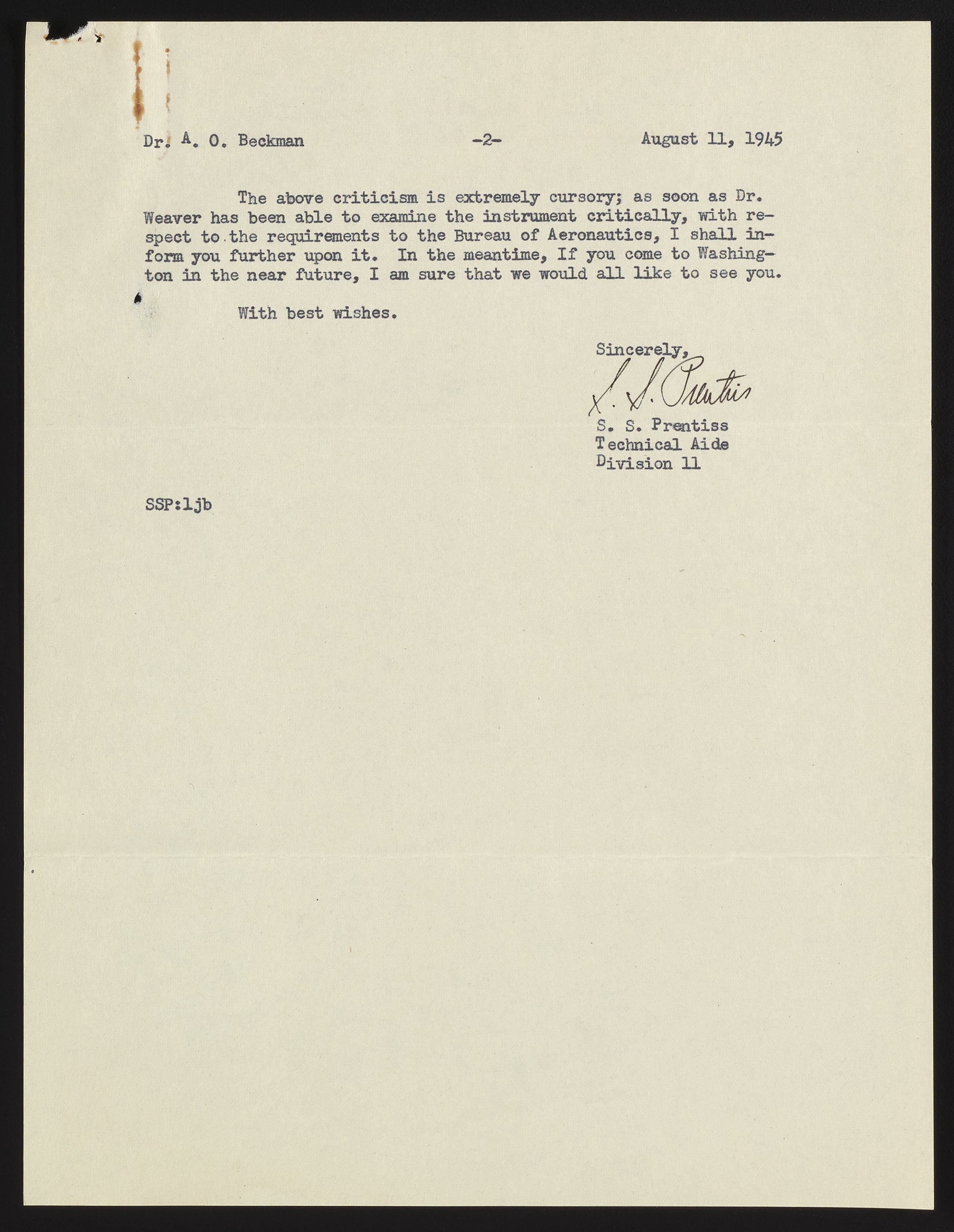 Letter from S. S. Prentiss to Arnold O. Beckman