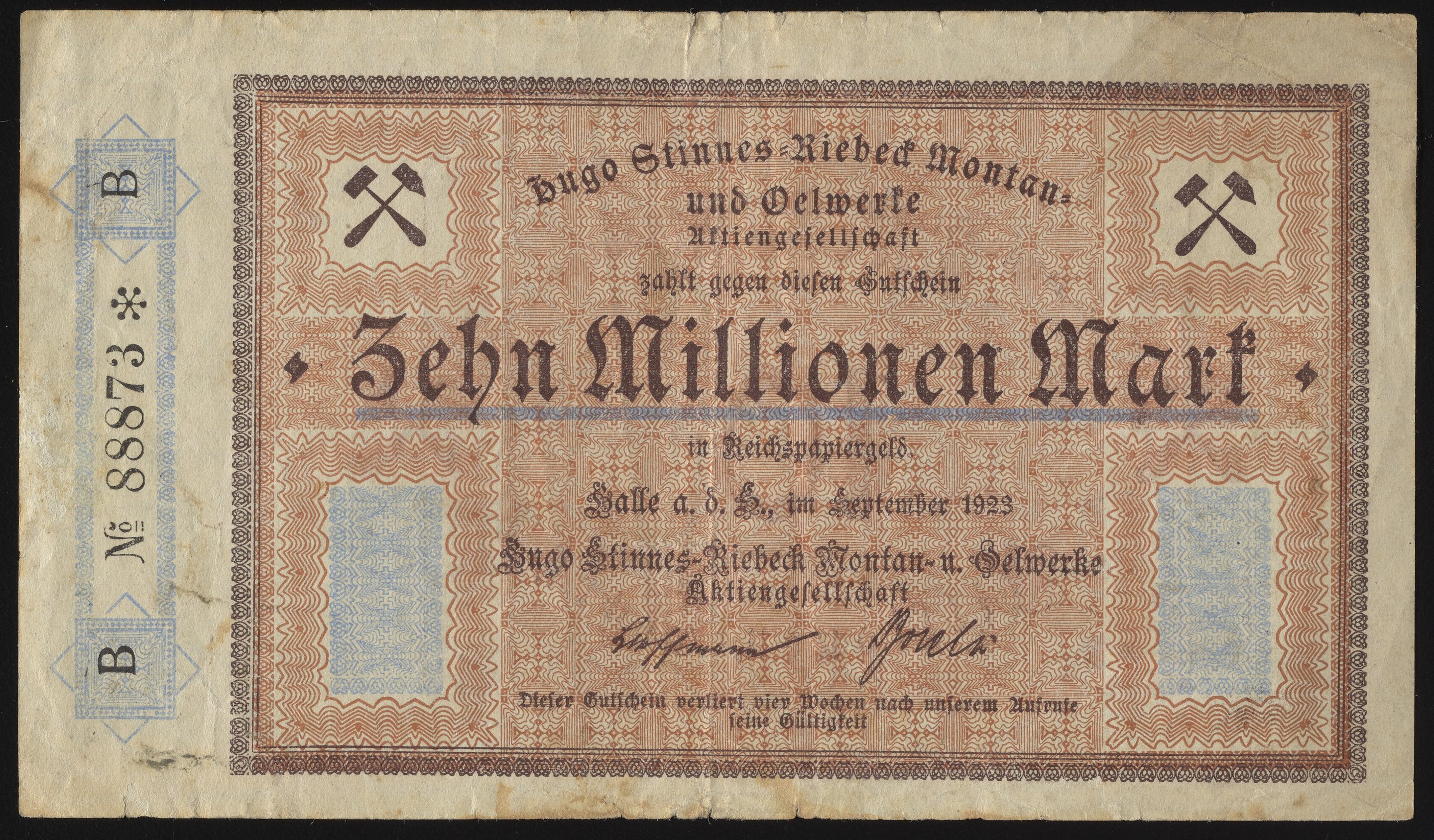 Small JPG1200 x 703px — 274 KBLarge JPG2880 x 1688px — 1.4 MBFull-sized JPG4231 x 2480px — 2.6 MBOriginal fileTIFF — 4231 x 2480px — 30.1 MBThis Zehn Millionen Mark Gutschein, or ten million Mark voucher, was issued by Hugo Stinnes-Riebeck Montan und Oelwerke (Hugo Stinnes-Riebeck Mining and Oil Works). Styled after a banknote, the rectp and verso of this company scrip include crossed hammer and pick symbols representing the mining industry. Paper features a watermark design.