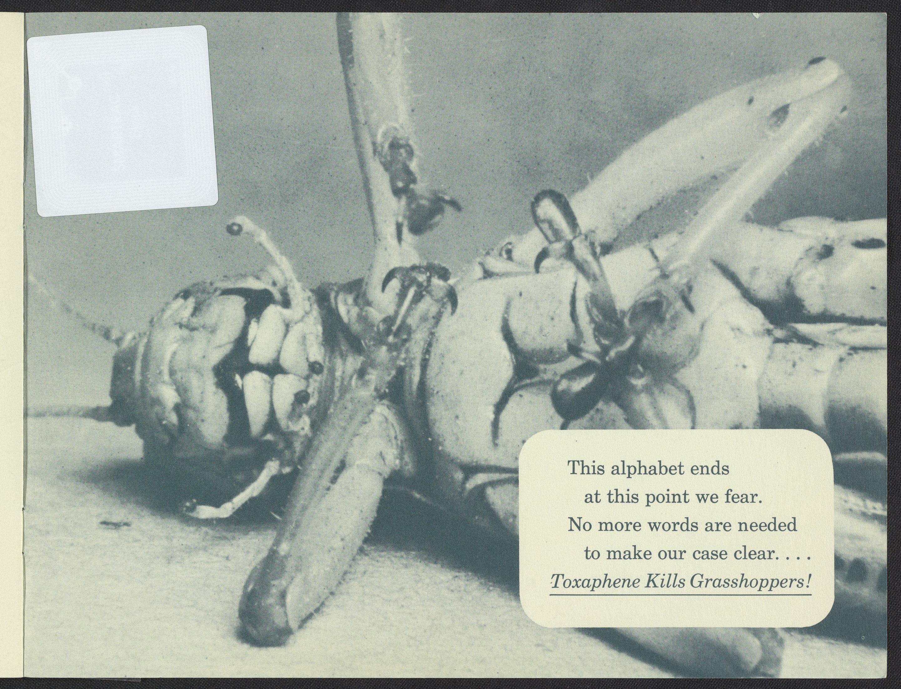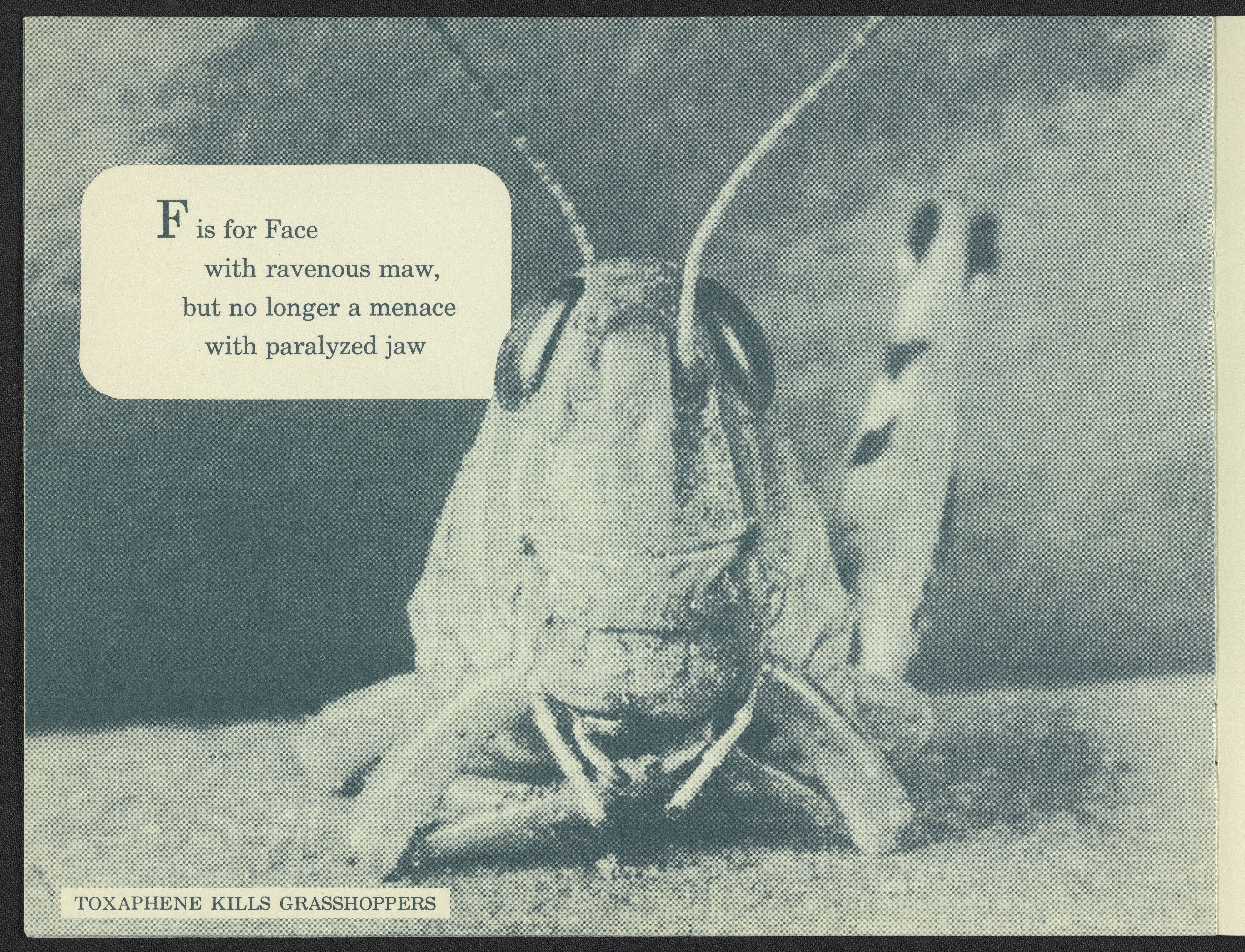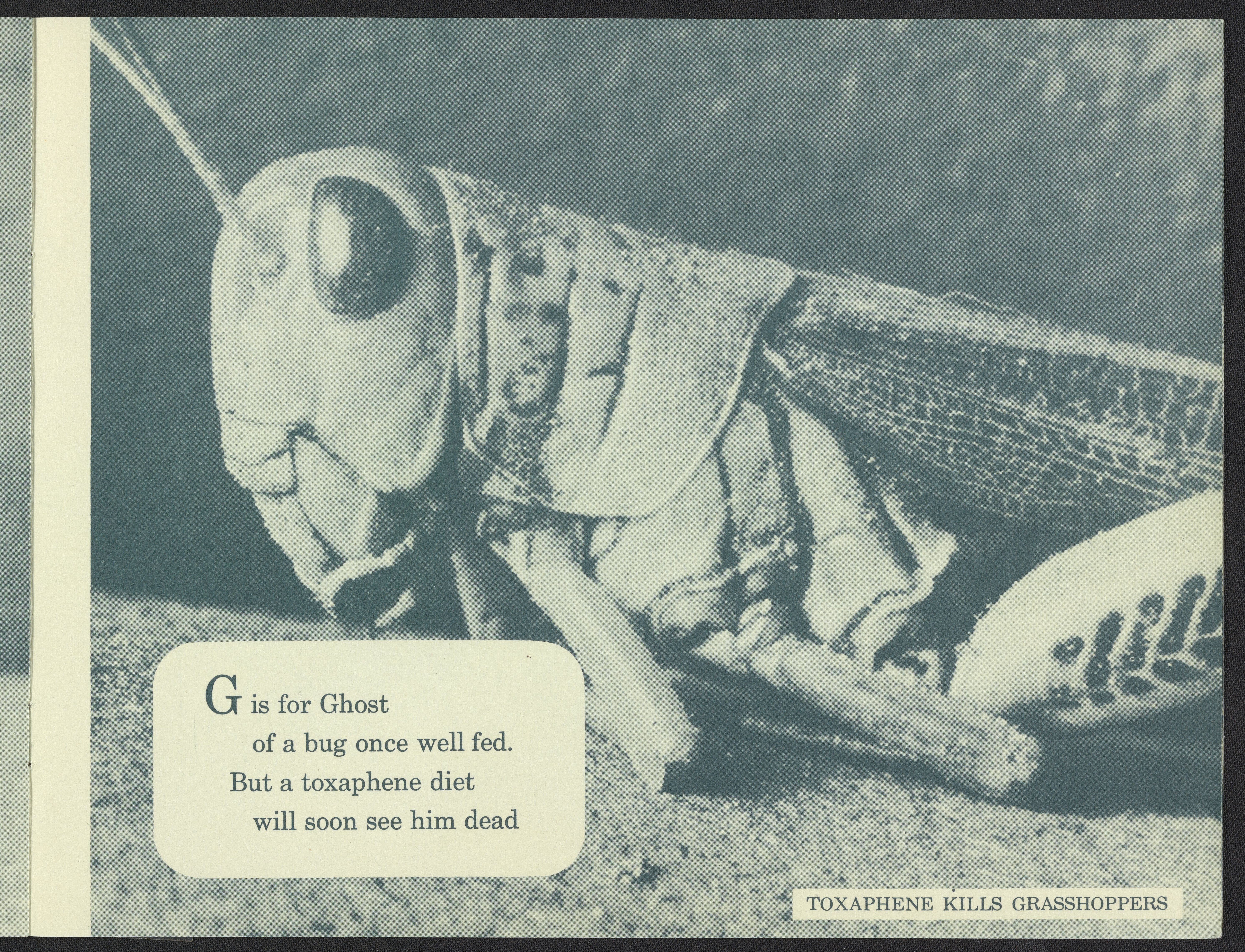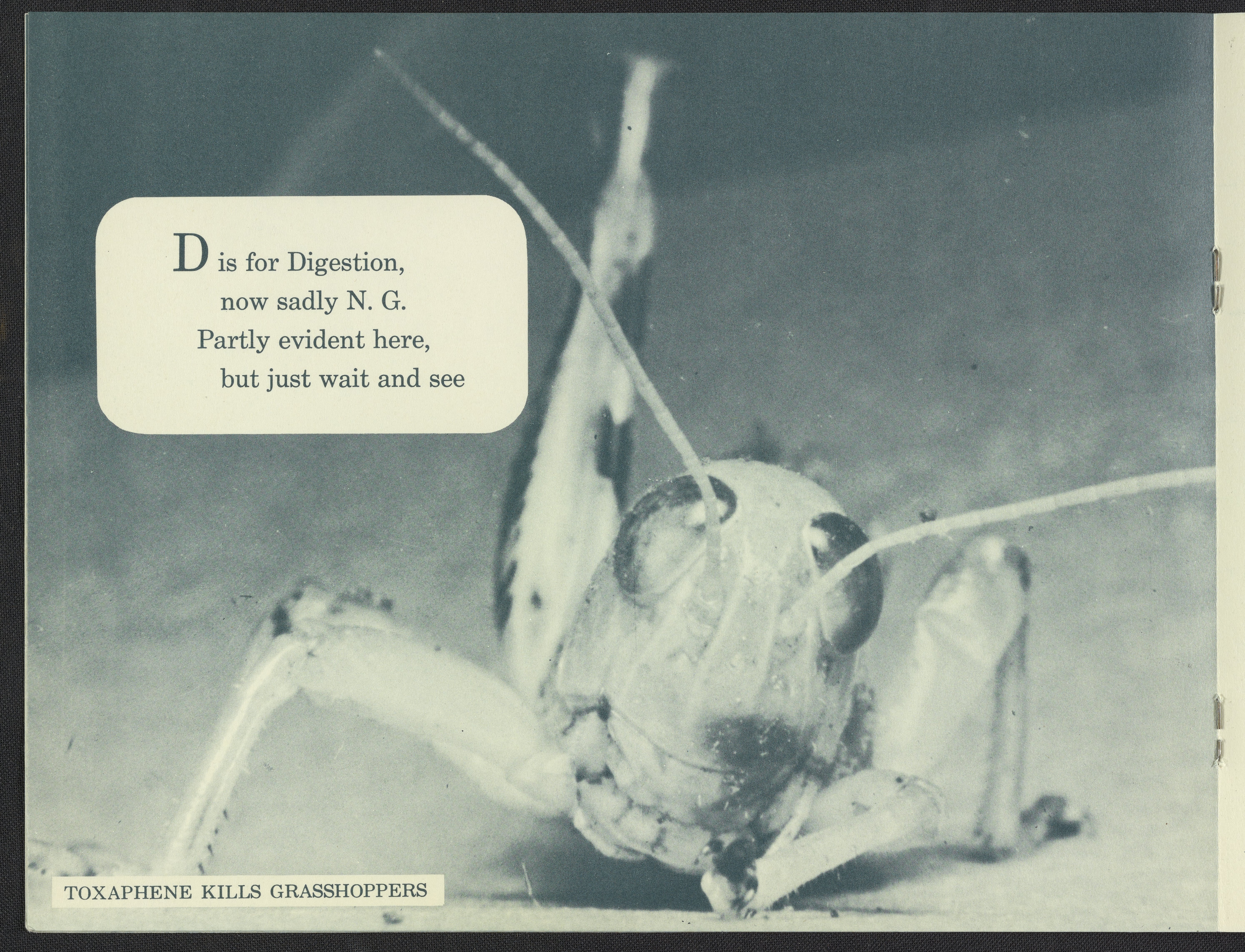 Small JPG1200 x 928px — 209 KBLarge JPG2880 x 2226px — 1.9 MBFull-sized JPG5914 x 4571px — 7.6 MBOriginal fileTIFF — 5914 x 4571px — 77.4 MBPamphlet in the form of a children's alphabet book depicts the stages of death inflicted upon a grasshopper with the use of Toxaphene pesticides produced by Hercules Powder Company.