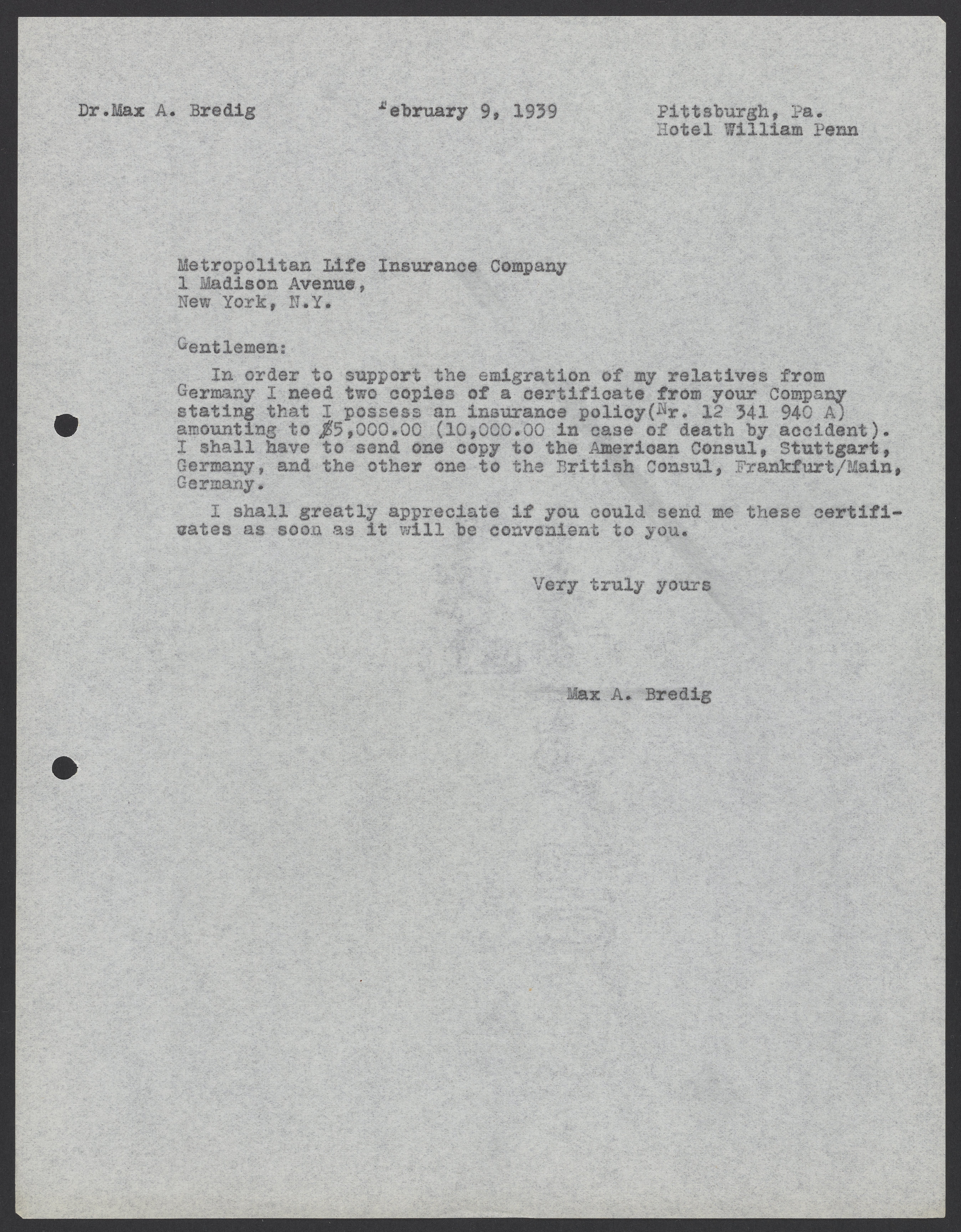 Max Albert Bredig (1902-1977) requests certificates confirming his life insurance policies. These certificates, which will be sent to consulates in Germany, are to help the emigration process for Bredig's family.