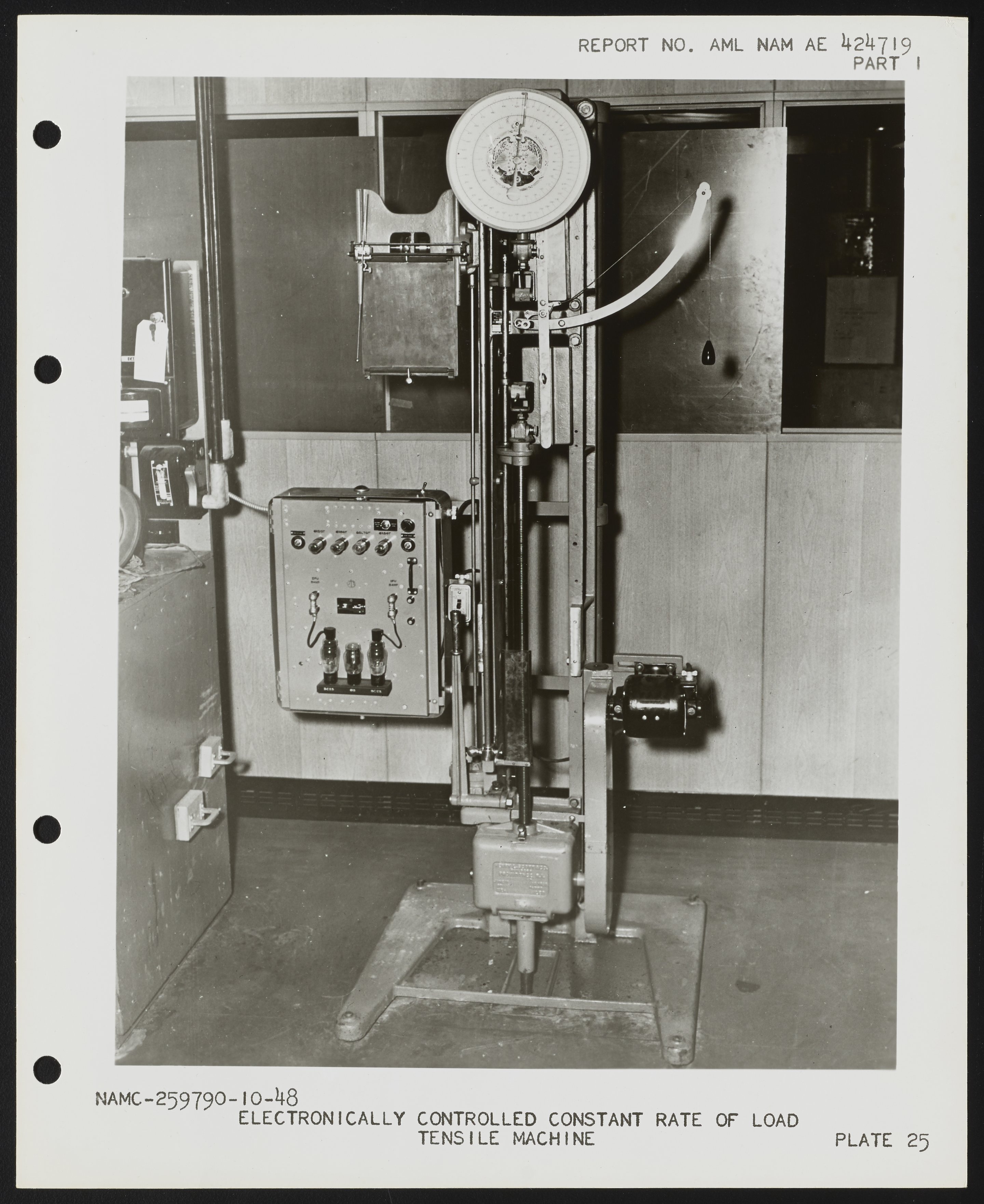 Naval Air Experimental Station, and United States. Navy. “Electronically Controlled Constant Rate of Load Tensile Machine,” circa 1949. Photographs from the Papers of J. Hartley Bowen, Box 1. Science History Institute. Philadelphia. https://digital.sciencehistory.org/works/jd472w463.
