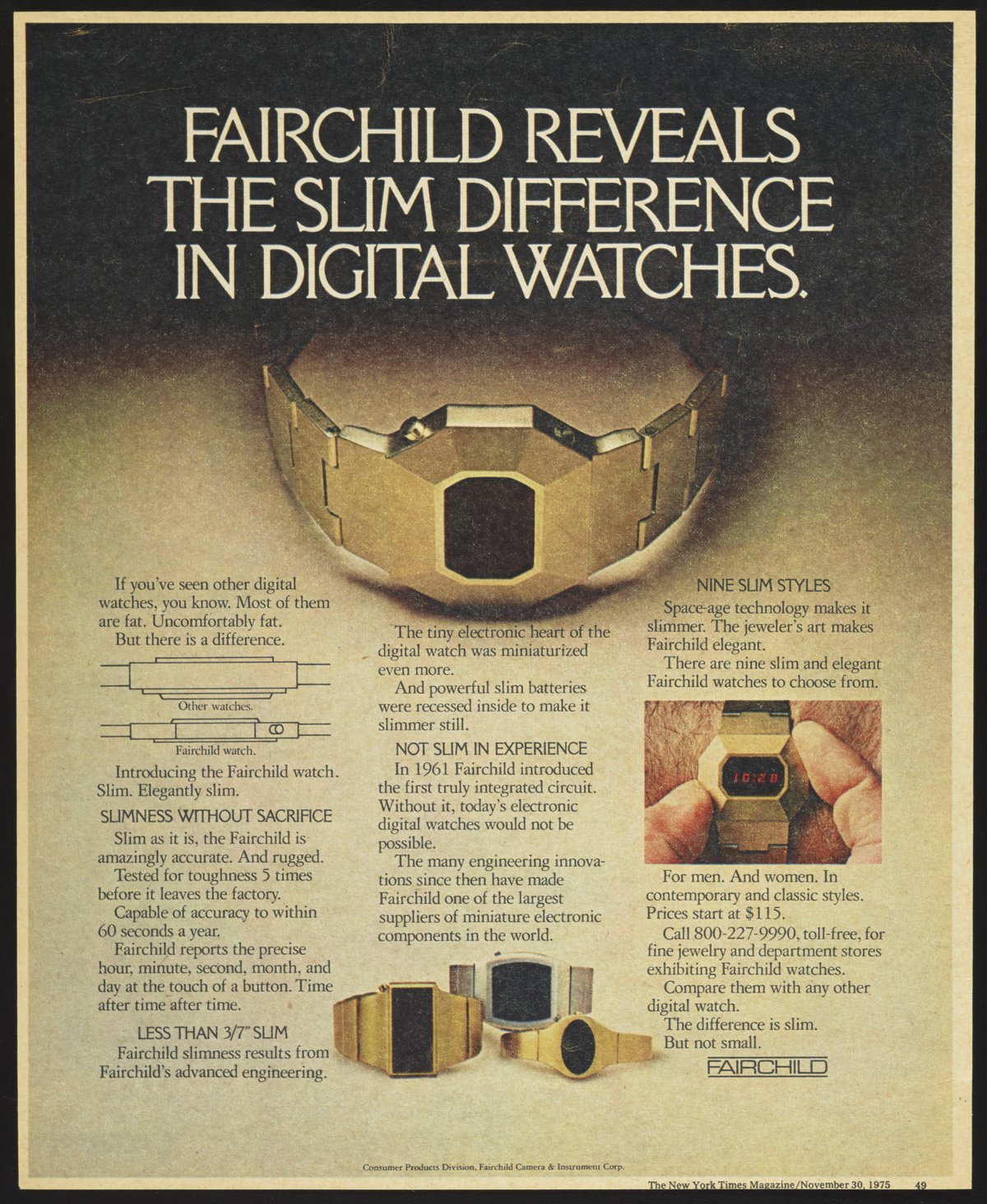 “Fairchild Reveals the Slim Difference in Digital Watches,” November 30, 1975. Science History Institute. Philadelphia. https://digital.sciencehistory.org/works/jd472w85s.