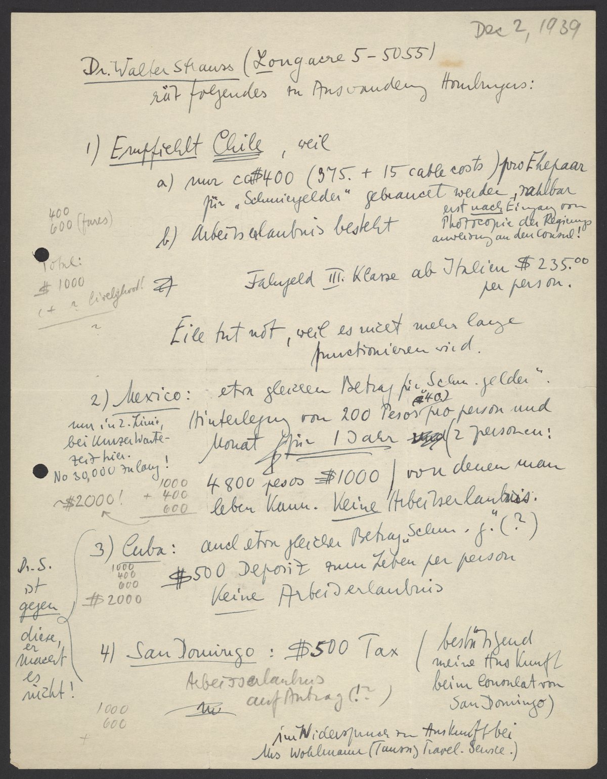 Notes regarding Dr. Walter Strauss' immigration