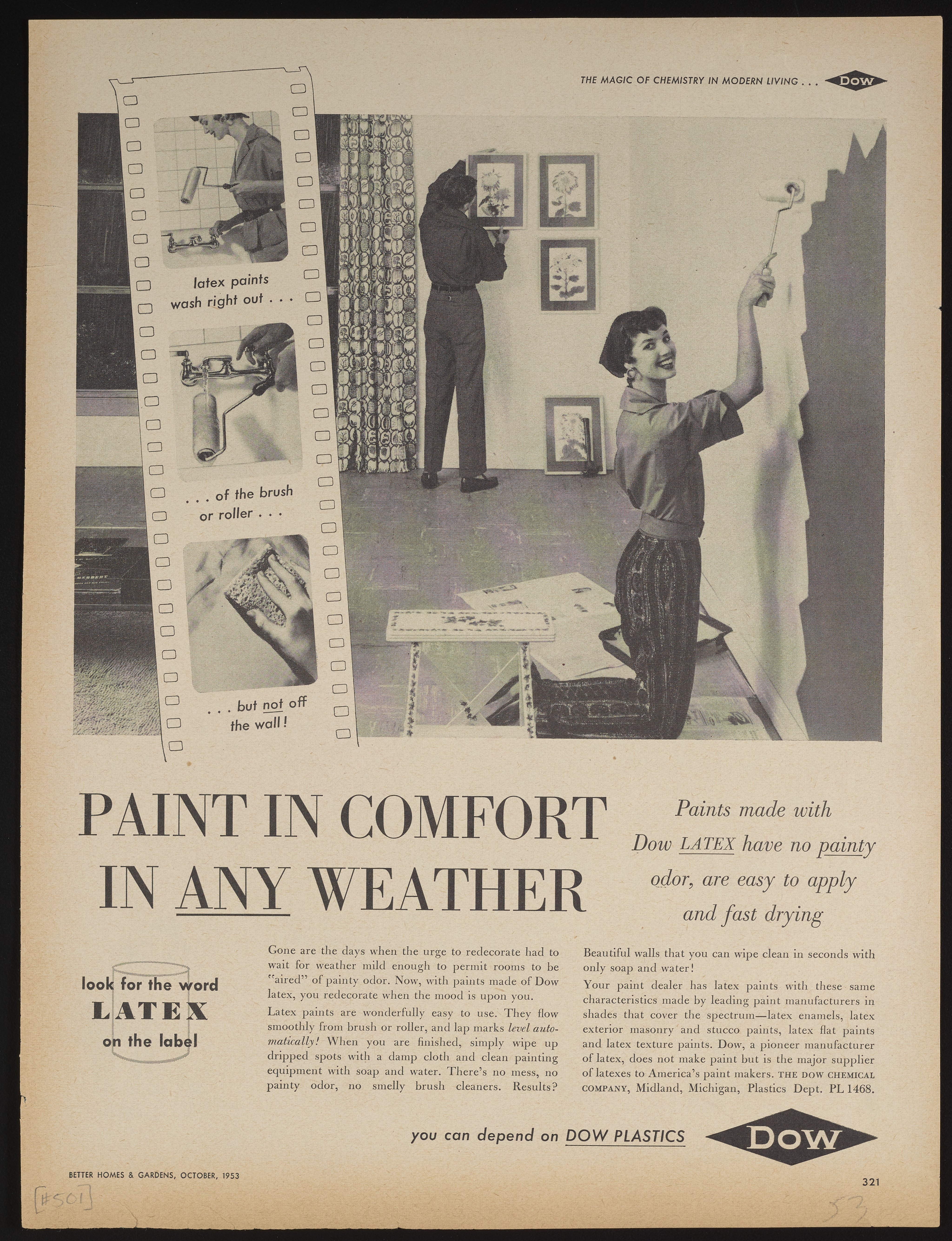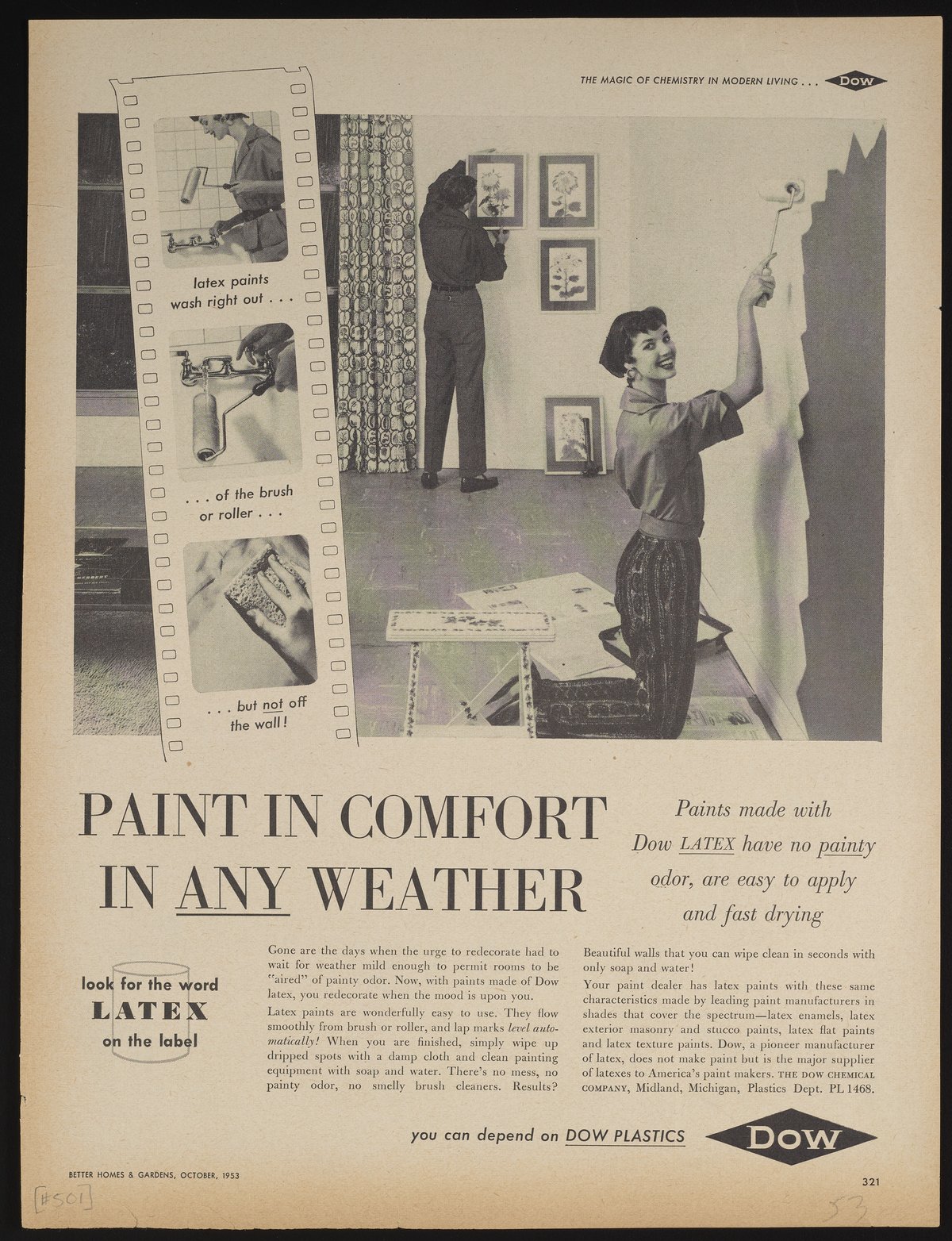 Print advertisement for Dow Latex Paints, a fast-drying and durable interior wall paint manufactured by the Dow Chemical Company. The advertisement features a woman applying paint to a wall with a roller, while a man in the background hangs a painting. An inset illustration, styled as a film strip, shows the woman washing paint off of the roller. The accompanying text describes the qualities of latex paints. This advertisement appeared on page 321 of the October 1953 edition of Better Homes & Gardens.