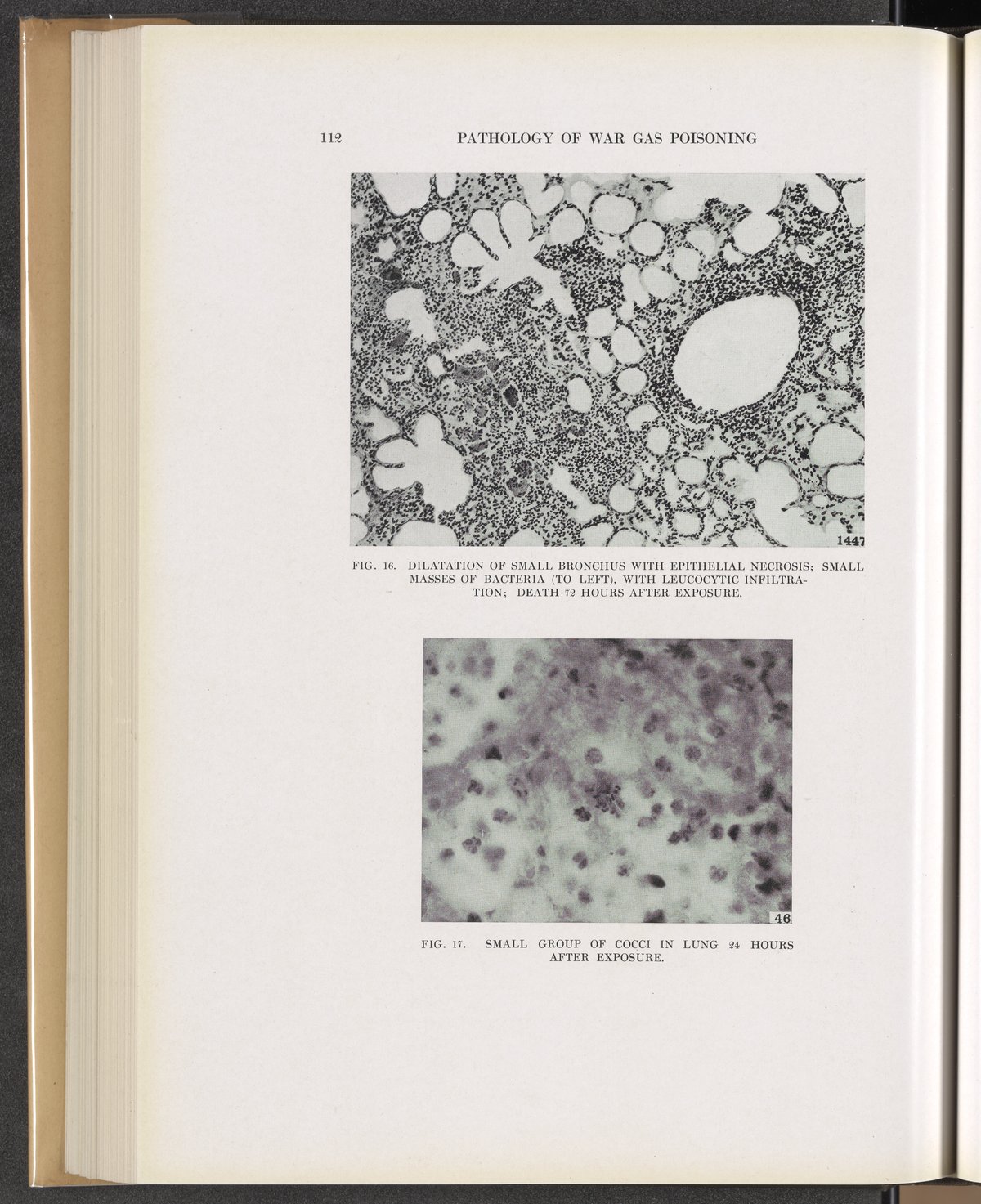 Winternitz, M. C. (Milton C.). “Fig. 16: Dilatation of Small Bronchus with Epithelial Necrosis; Small Masses of Bacteria (to Left) with Leucocytic Infiltration; Death 72 Hours after Exposure. Fig. 17: Small Group of Cocci in Lung 24 Hours after Exposure.” Collected Studies on the Pathology of War Gas Poisoning. New Haven, Connecticut: Yale University Press, 1920. https://digital.sciencehistory.org/works/jh343s452.