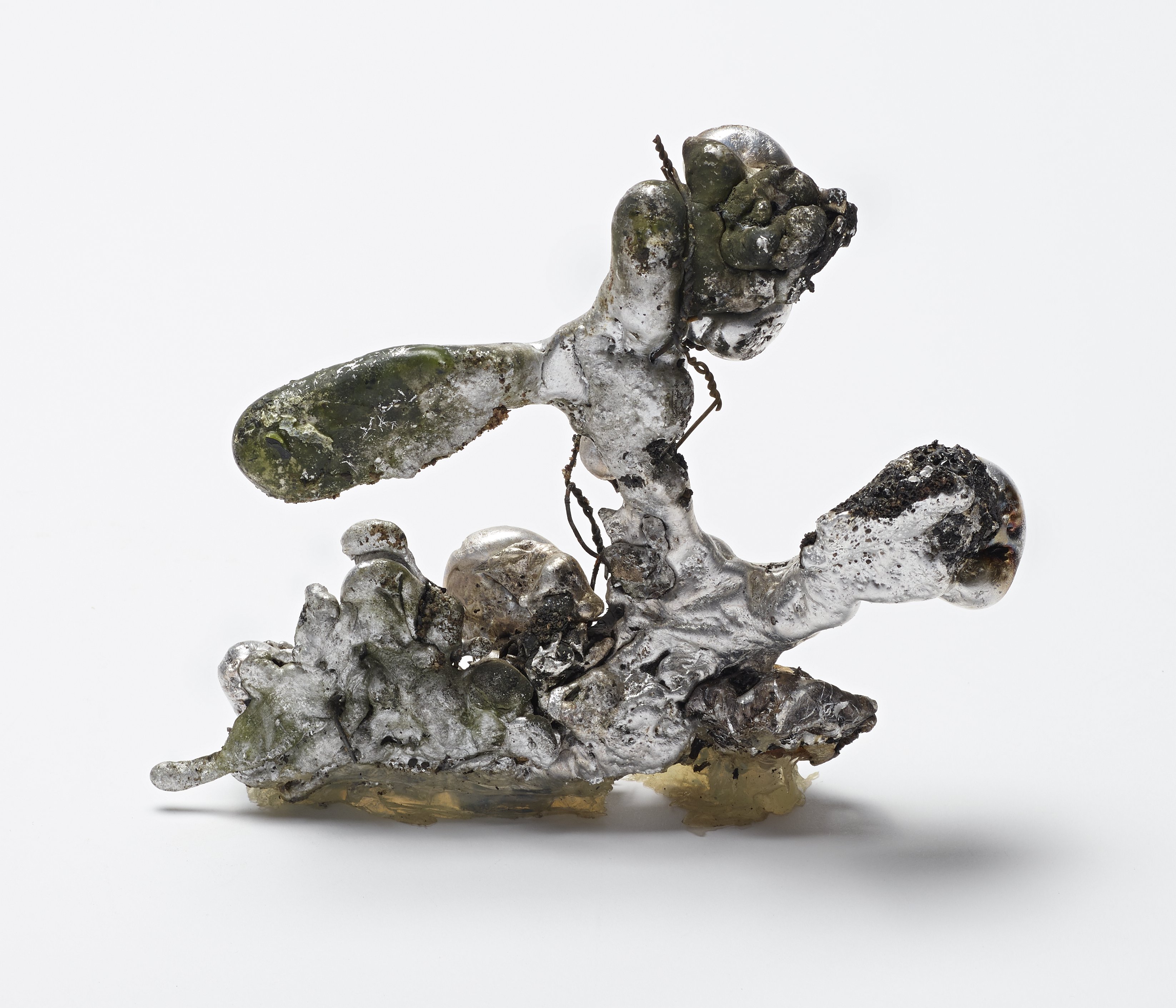 Small JPG1200 x 1028px — 149 KBLarge JPG2880 x 2468px — 684 KBFull-sized JPG3291 x 2820px — 874 KBOriginal fileTIFF — 3291 x 2820px — 26.6 MBIrregularly-shaped piece of foam-like silver plastic; pieces of twisted copper wire are holding some portions together; bottom has a wax or glue-like material coating it; some areas have a blackened, charred appearance.