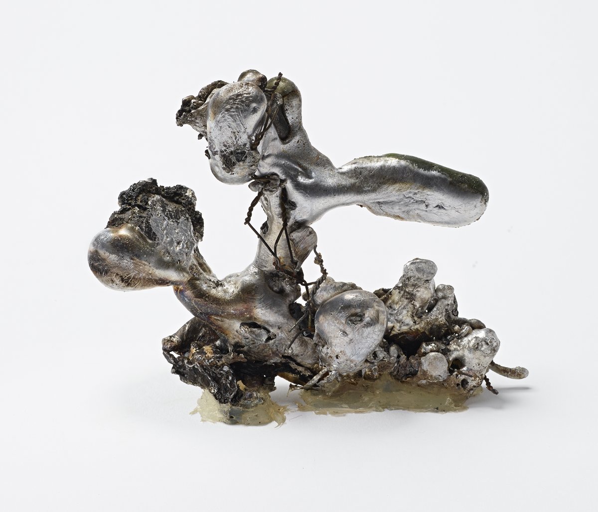 Small JPG1200 x 1028px — 149 KBLarge JPG2880 x 2468px — 684 KBFull-sized JPG3291 x 2820px — 874 KBOriginal fileTIFF — 3291 x 2820px — 26.6 MBIrregularly-shaped piece of foam-like silver plastic; pieces of twisted copper wire are holding some portions together; bottom has a wax or glue-like material coating it; some areas have a blackened, charred appearance.