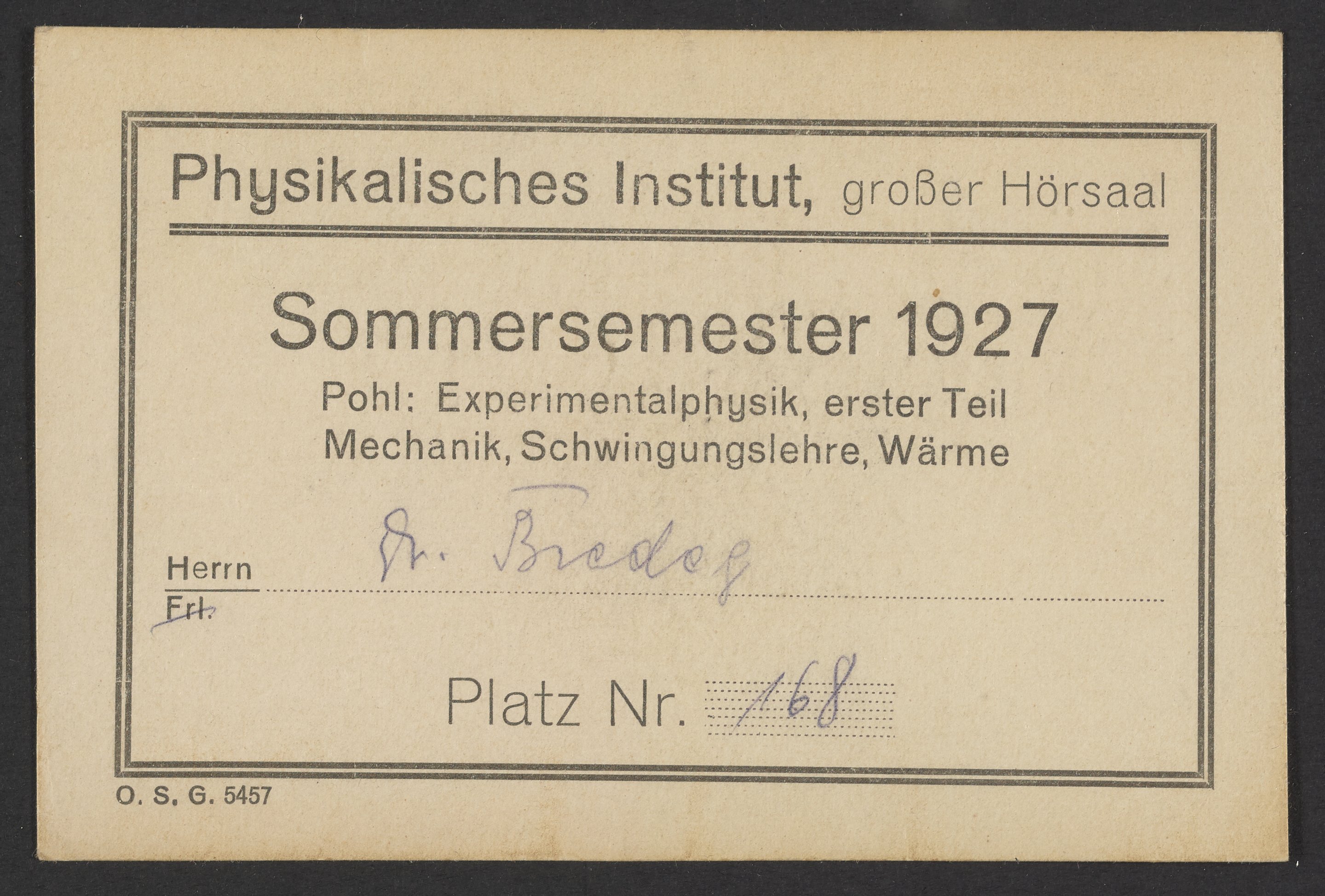 Card indicating a place number for Georg Bredig for a lecture on experimental physics, including mechanics and oscillation theory, at the Physikalisches Institut.