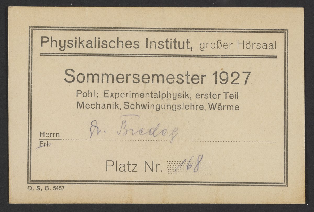 Physikalisches Institut. “Placeholder for a Summer Semester Lecture at the Physikalisches Institut,” 1927. Papers of Georg and Max Bredig, Box 3, Folder 5. Science History Institute. Philadelphia. https://digital.sciencehistory.org/works/jkfmul3.