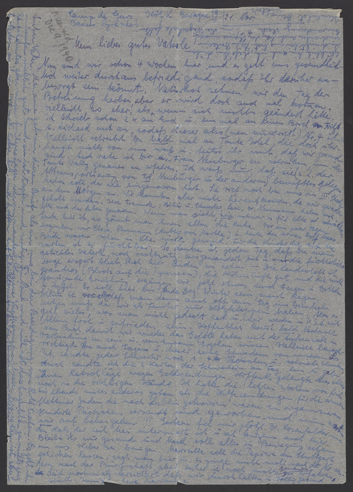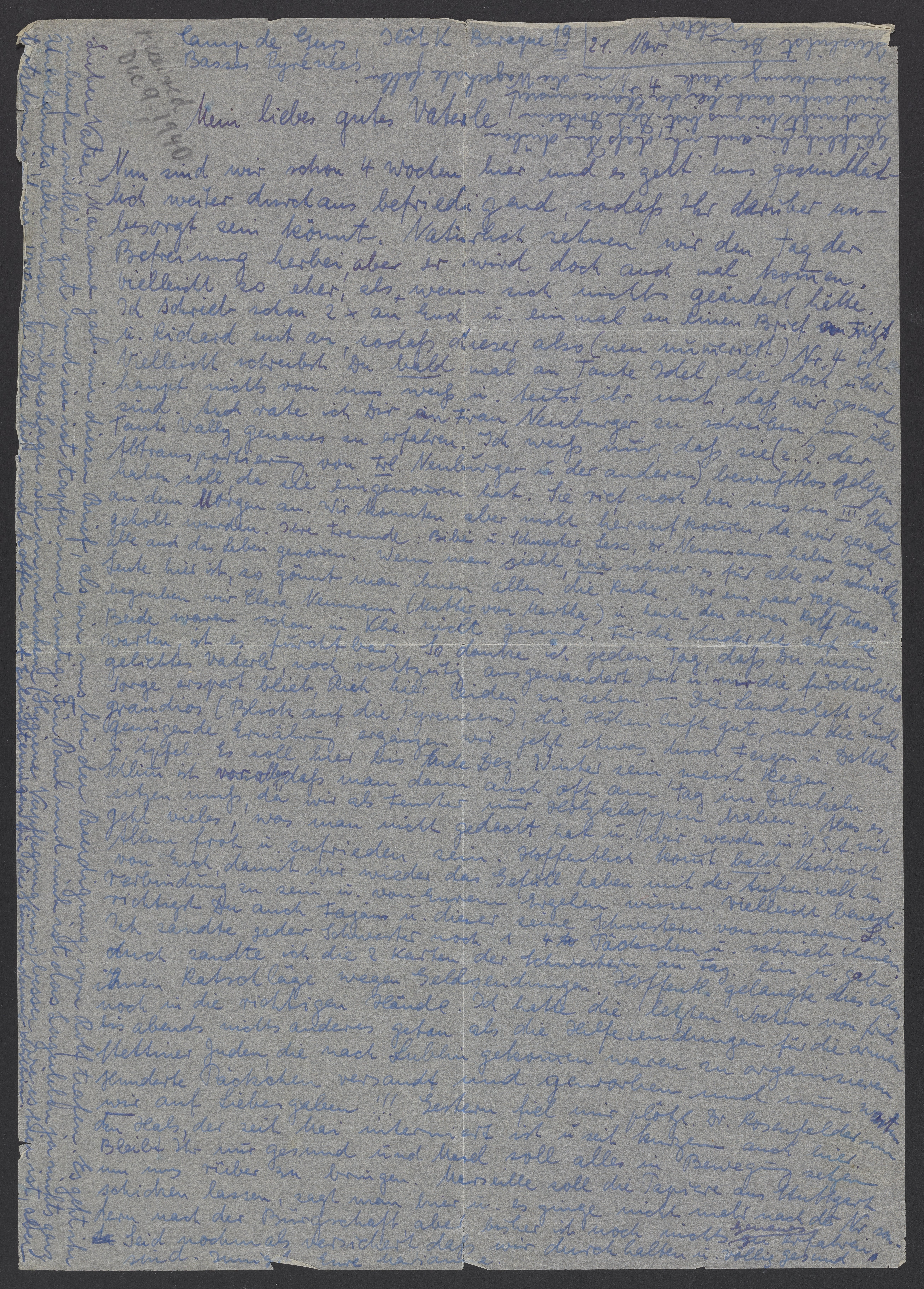 We have been here for four weeks now, and our health is still quite good, so you don’t need to worry about us. Of course, we long for the day of our liberation, but it will come one day. Perhaps this is more so the case than if nothing had changed. I have already written to you twice and I also wrote one letter to Fritz and Richard. Hence, this letter is #4 (renumbered). Maybe you can write to Aunt Idel soon, who doesn't know anything about our situation, and tell her that we’re healthy. I also advise you to write to Mrs. Neuburger to find out more about Aunt Vally. I only know that she was supposedly lying unconscious (when Mrs. Neuburger and the others were being deported) because she ingested something. She called up to us on the third floor that morning. However, we couldn’t come up because we were all being arrested. Her friends, Bibi, her sister, Liss, and Dr. Neumann, all took their own lives. When you see how difficult it is here for all the weak and old people, you let them rest. A few days ago, we buried Clara Neumann (Martha’s mother) and today we buried poor Rolf Maas. Both were not healthy in Karlsruhe. It is terrible for their children who are waiting for them. My dear Father, I am therefore grateful that you emigrated in time and that I was spared the terrible anguish of seeing you suffer here. The landscape is beautiful (view of the Pyrenees), the mountain air is good, and we now supplement our insufficient diet with figs, dates, and apples. It’s supposed to be winter here until the end of December, and mostly with rain.