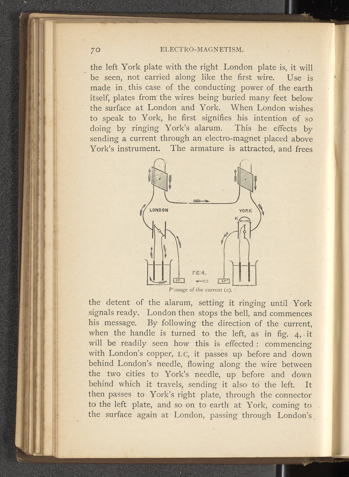 Diagram depicting the passage of current between the cities of London and York in a needle telegraph system. One of the two main types of electromagnetic telegraphs, needle telegraphs use indicating needles moved electromagnetically as a means of displaying messages.