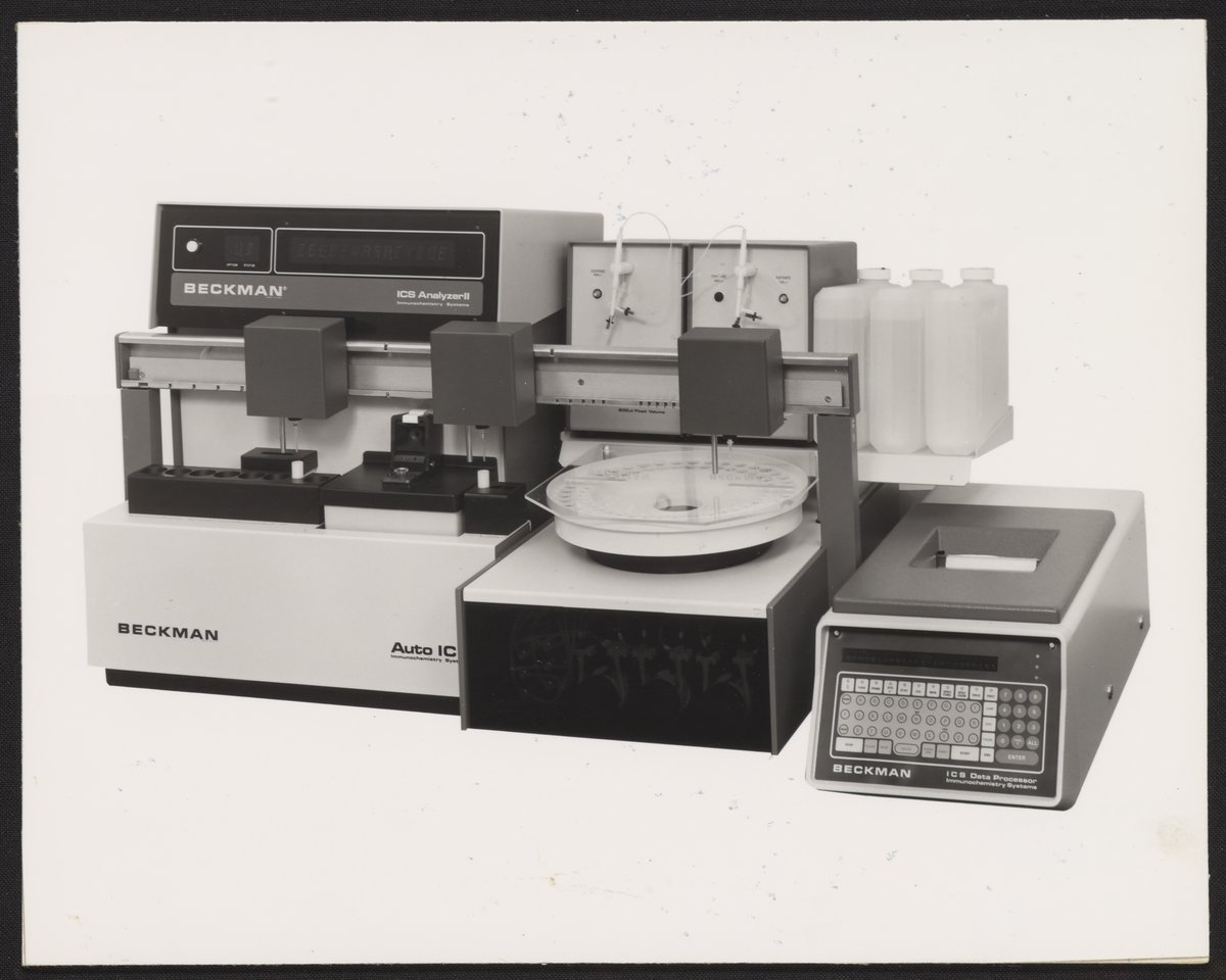 First produced in 1980, the Beckman Auto ICS (Immunochemistry System) is a fully automated system that measures specific protein concentrations in body fluids. It can be used to monitor the presence and concentration of drugs in the human body.