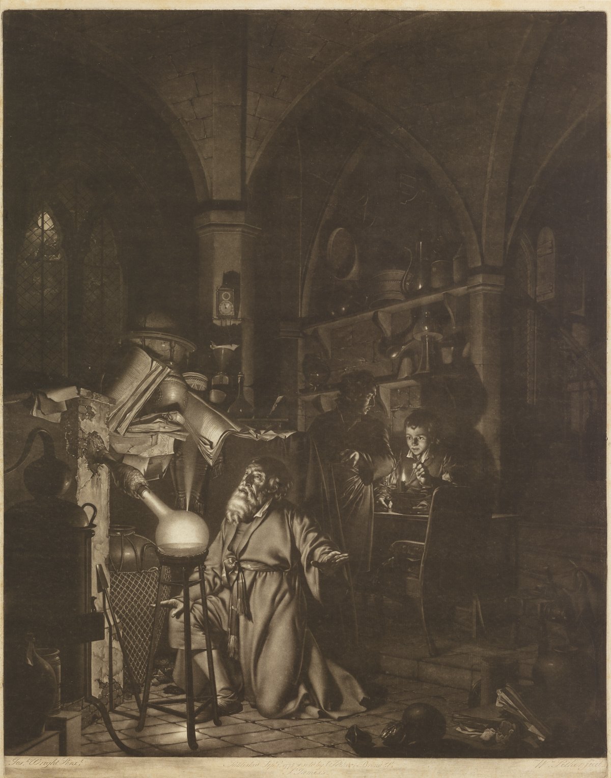 This mezzotint by William Pether, after the 1771 painting by Joseph Wright of Derby, shows a kneeling alchemist in his laboratory, gazing in wonder at the results of his latest experiment. The painting's full original title is “The Alchymist, in Search of the Philosopher's Stone, Discovers Phosphorus, and prays for the successful Conclusion of his operation, as was the custom of the Ancient Chymical Astrologers”. Wright's painting thus may represent the discovery of phosphorus attributed to the Hamburg alchemist Hennig Brandt in 1669. This popular story was printed and re-printed in chemical histories during Wright's lifetime. Phosphorus, a highly reactive element, emits a faint glow in the presence of oxygen, a response known as chemiluminescence. Here, the glowing matter in the alchemist's vessel throws the laboratory into stark relief, highlighting the edges of books and glassware and giving the composition an ethereal radiance.