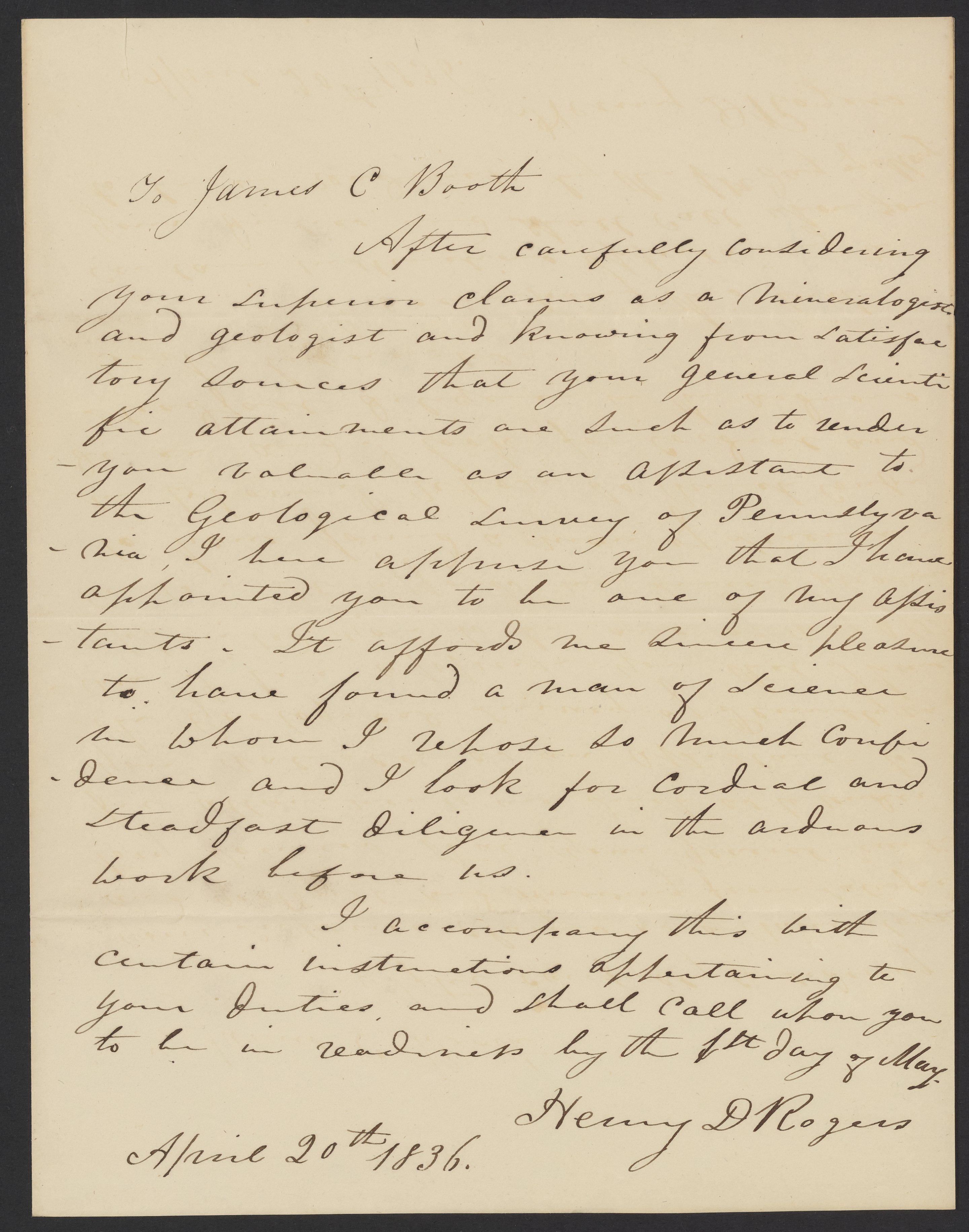 Letter from Henry D. Rogers to James Curtis Booth, April 20, 1836