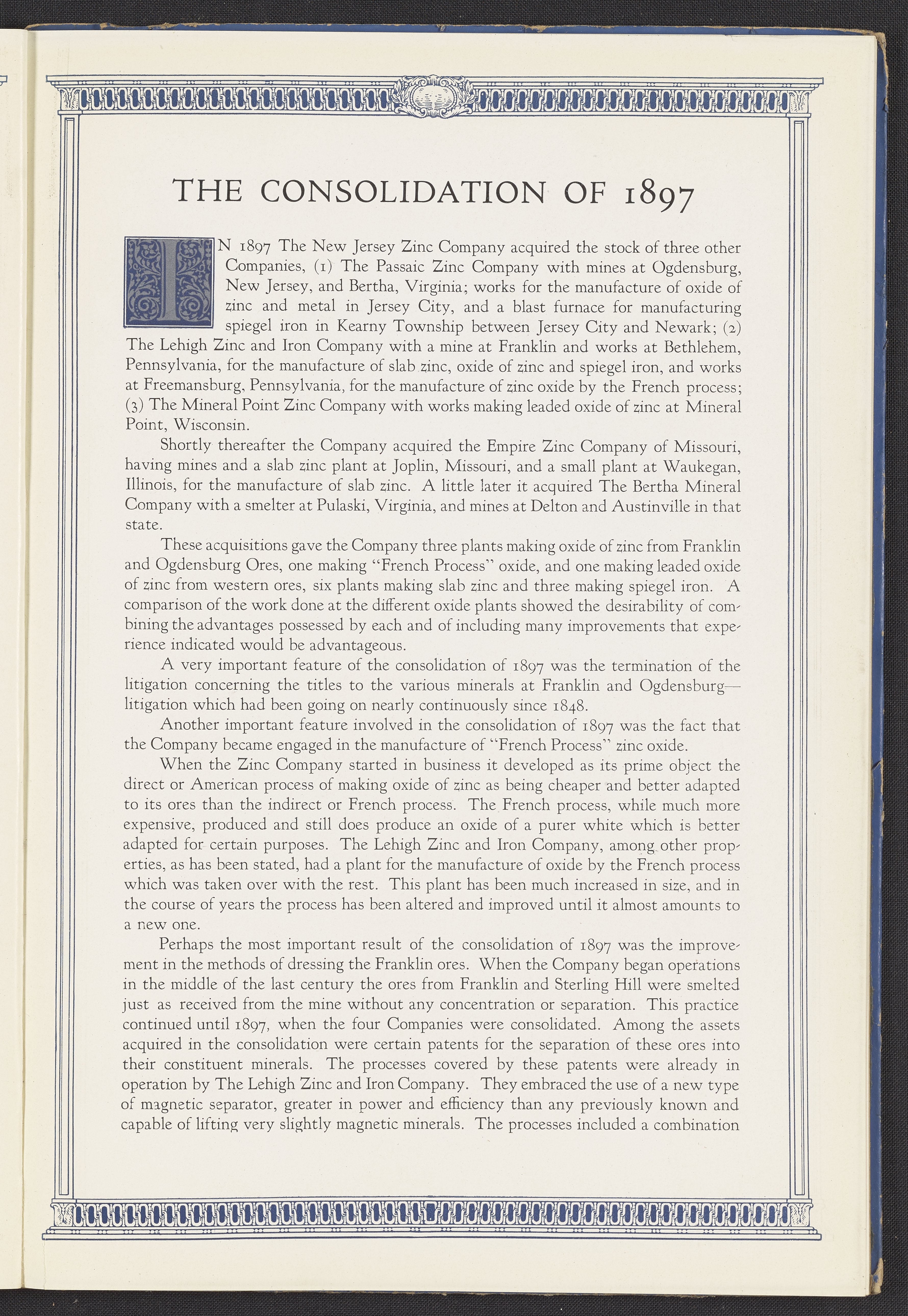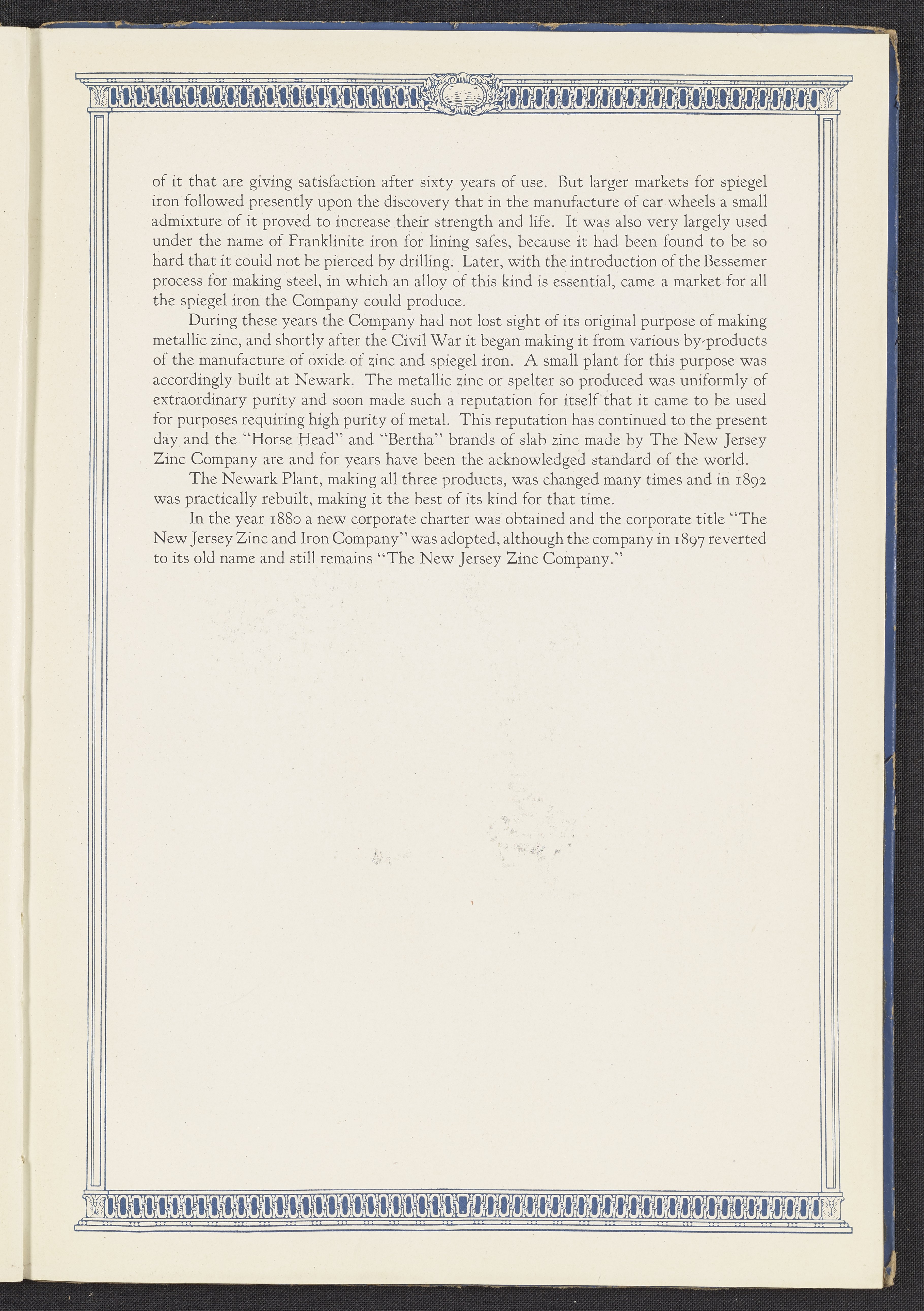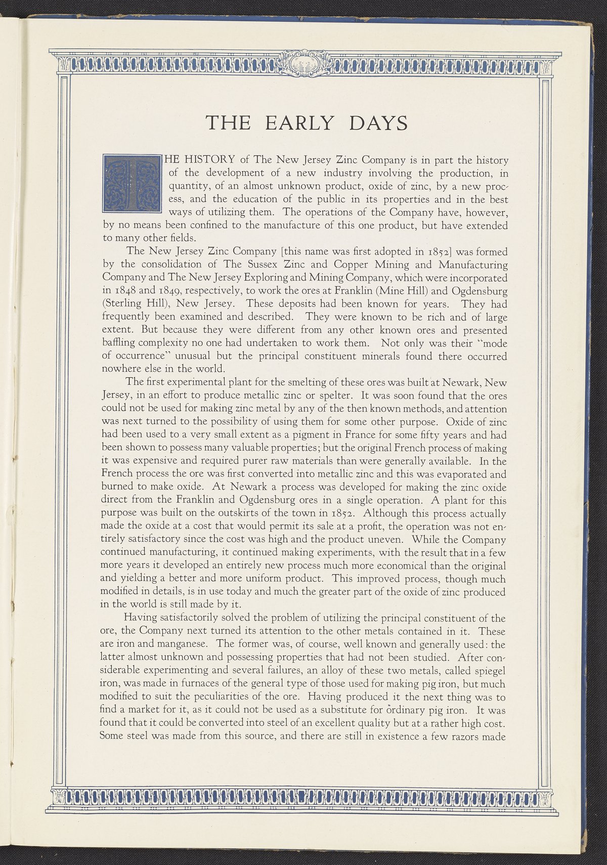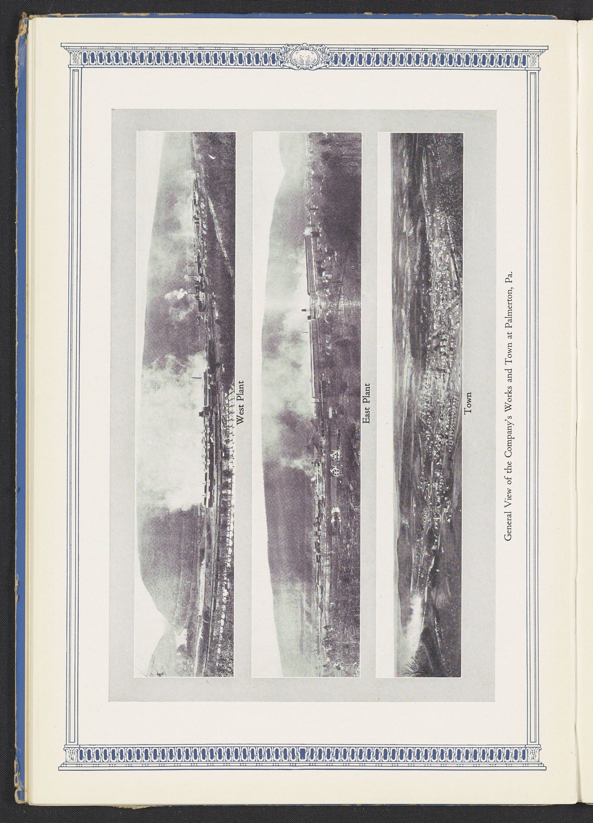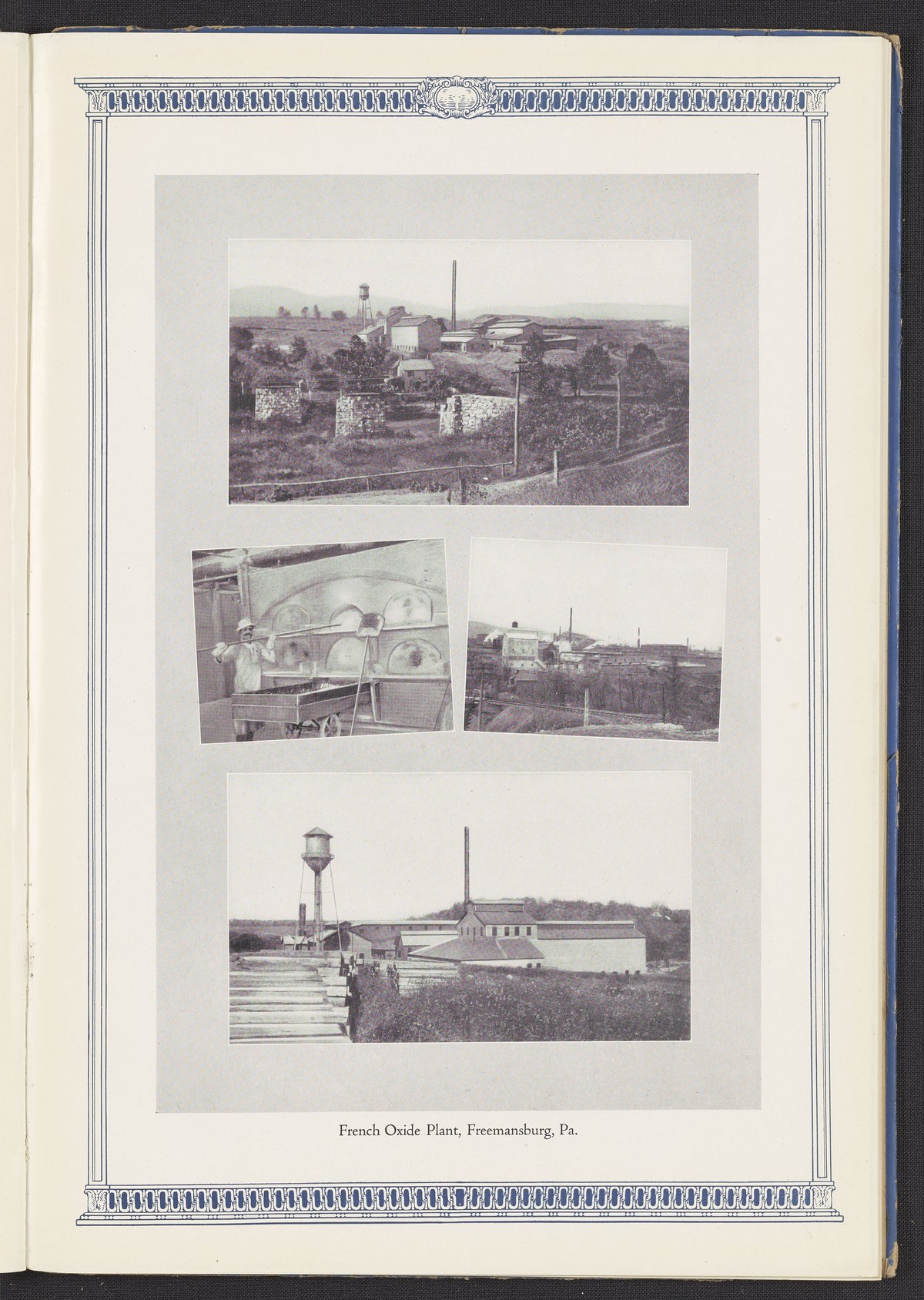 Small JPG1200 x 1652px — 278 KBLarge JPG2880 x 3966px — 1.6 MBFull-sized JPG3740 x 5150px — 2.5 MBOriginal fileTIFF — 3740 x 5150px — 55.2 MBA corporate history of the New Jersey Zinc Company, thoroughly illustrated with black and white photographic prints. The New Jersey Zinc Company (now the Horsehead Holding Corporation), founded in 1848 in Pittsburgh Pennsylvania, was the largest producer of Zinc in the United States from 1897 to 1966. The work is digitized in its entirety.