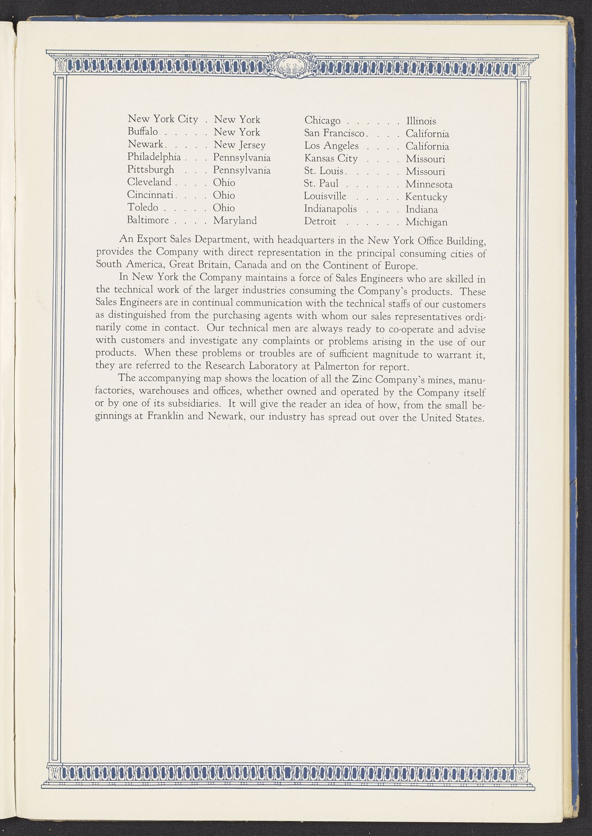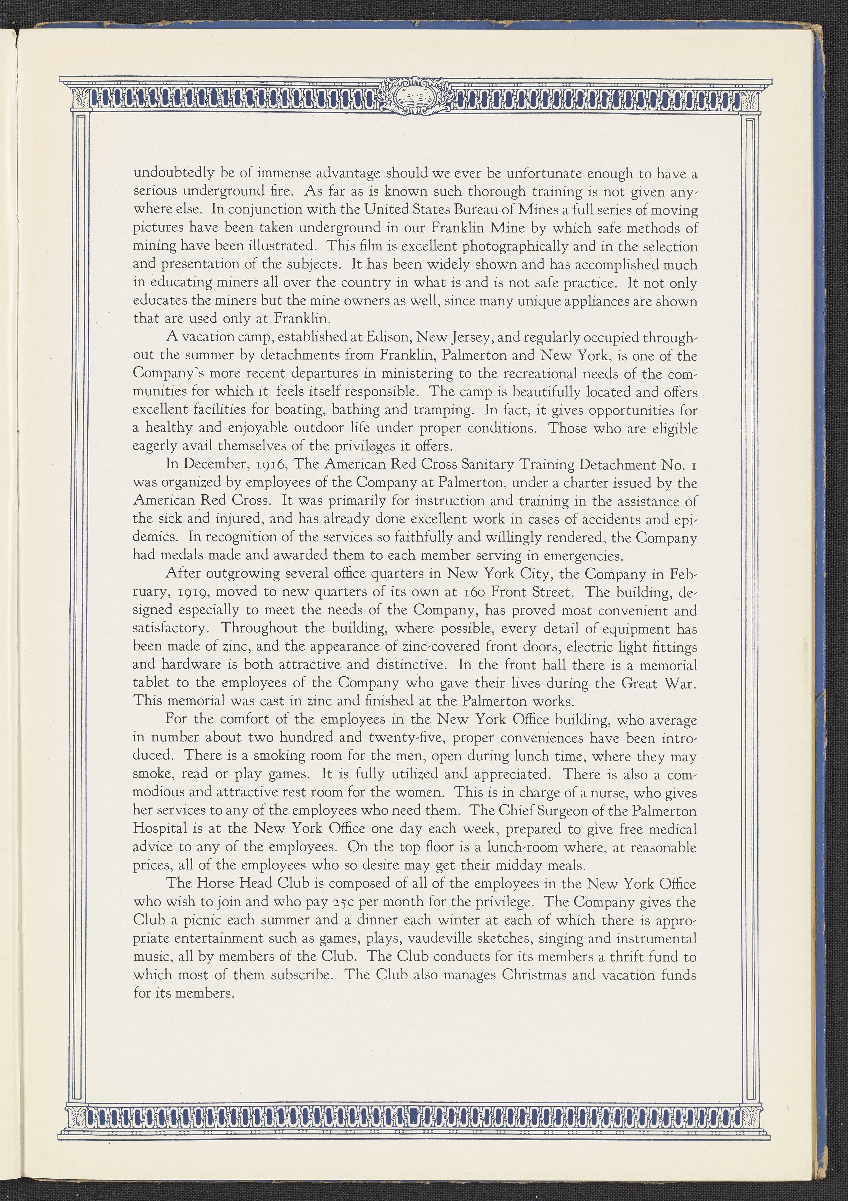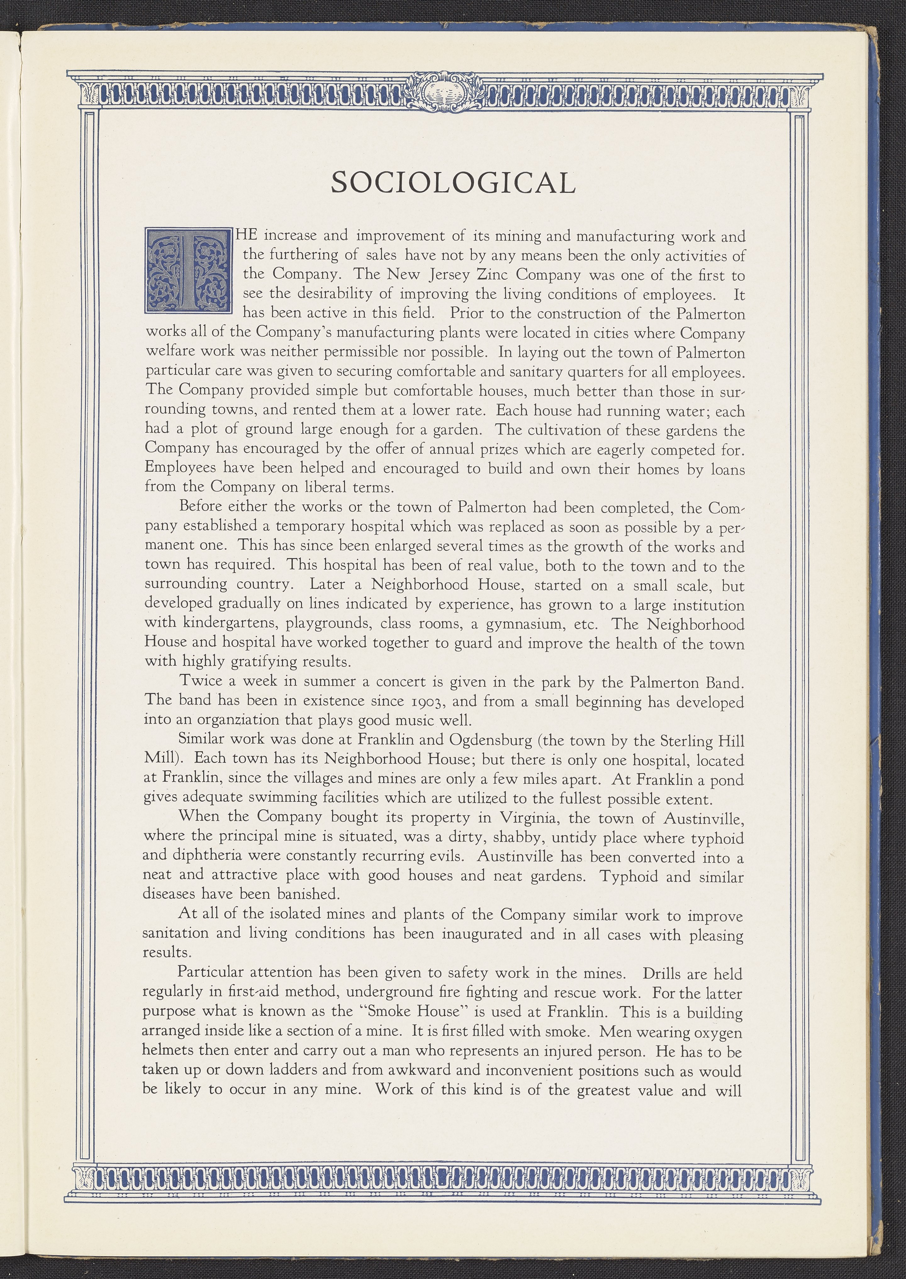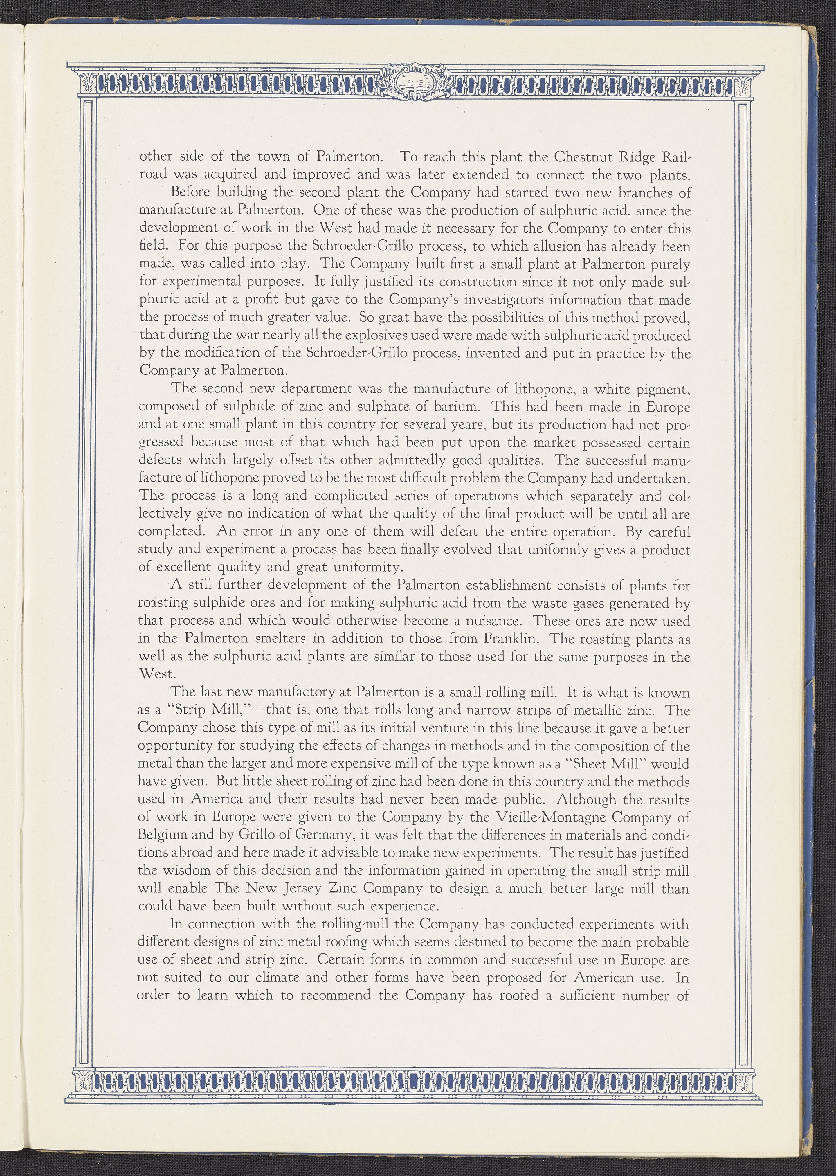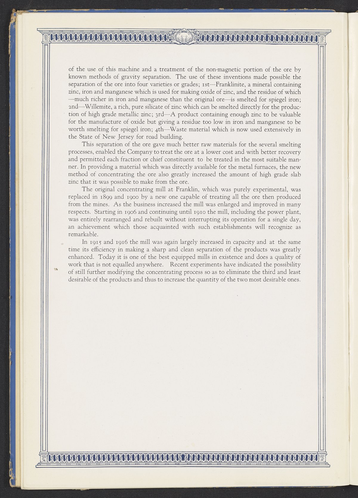 Small JPG1200 x 1652px — 278 KBLarge JPG2880 x 3966px — 1.6 MBFull-sized JPG3740 x 5150px — 2.5 MBOriginal fileTIFF — 3740 x 5150px — 55.2 MBA corporate history of the New Jersey Zinc Company, thoroughly illustrated with black and white photographic prints. The New Jersey Zinc Company (now the Horsehead Holding Corporation), founded in 1848 in Pittsburgh Pennsylvania, was the largest producer of Zinc in the United States from 1897 to 1966. The work is digitized in its entirety.