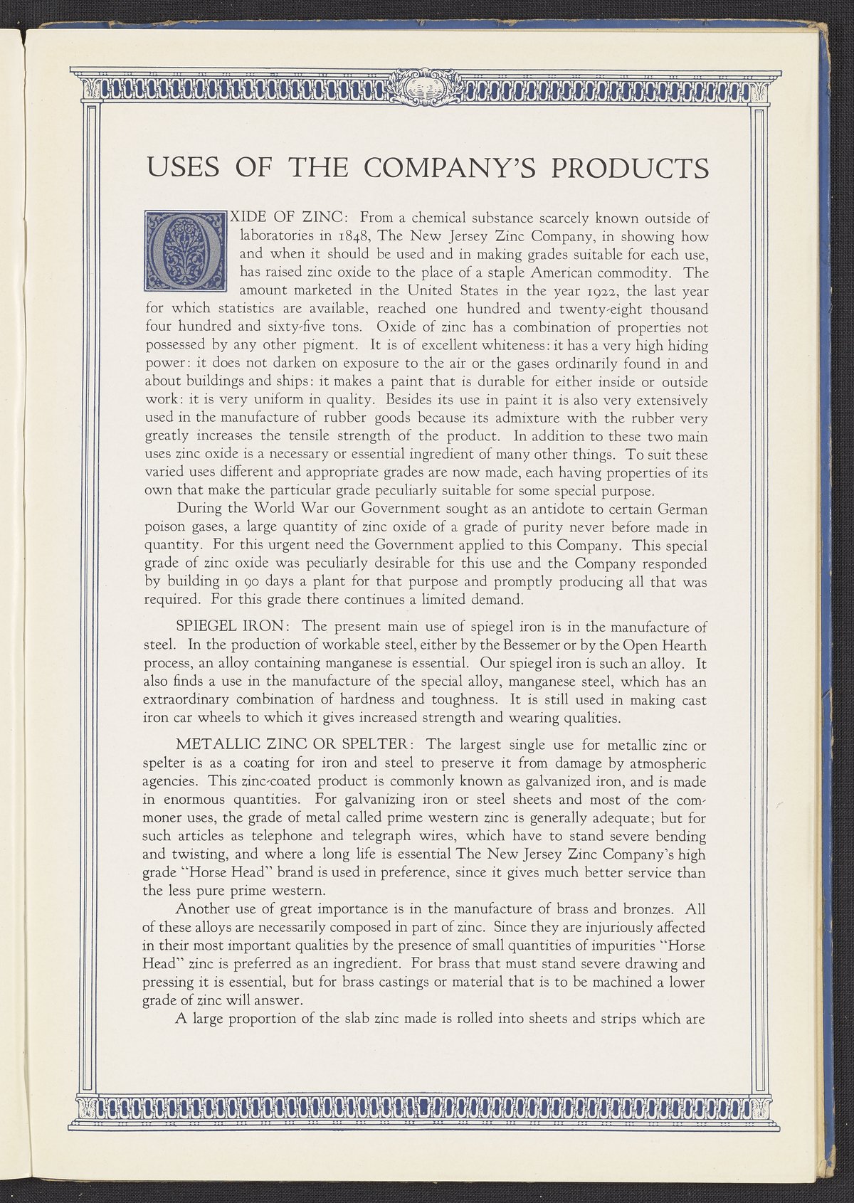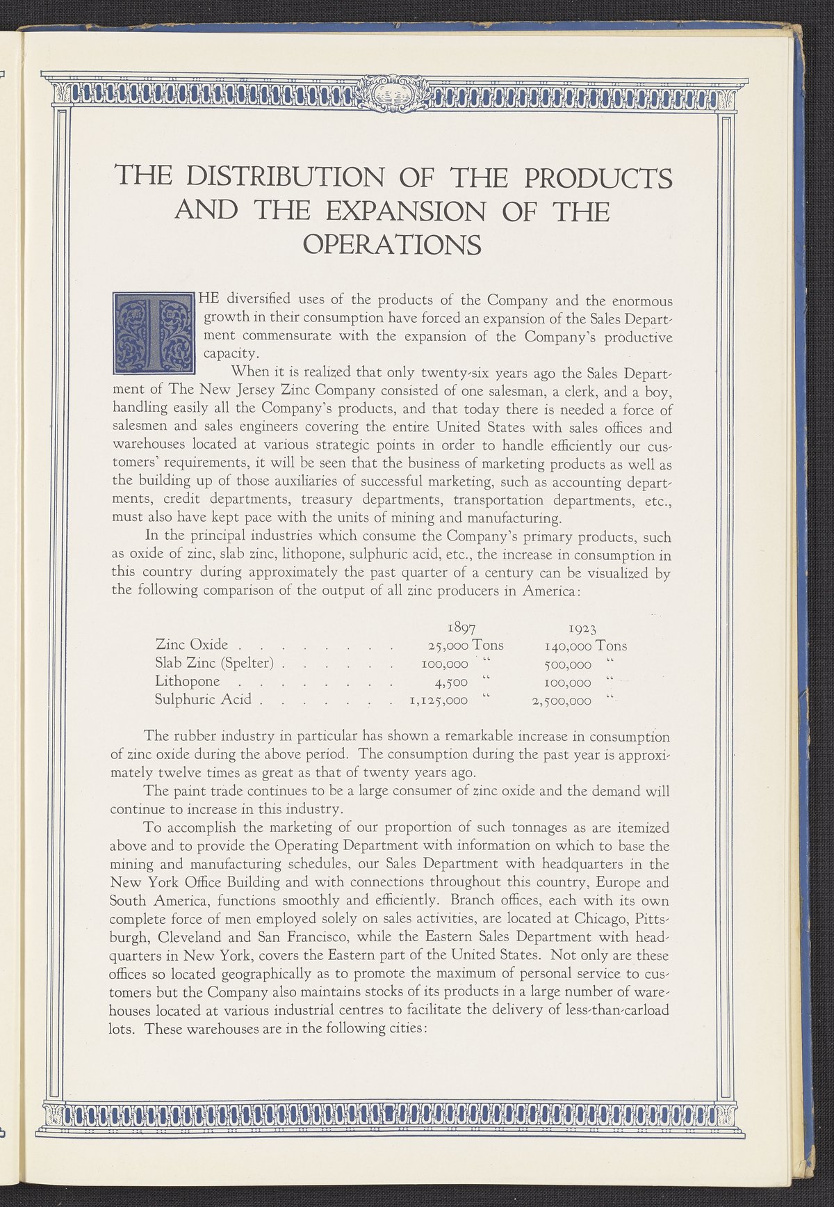 New Jersey Zinc Company. “A Record of Accomplishment, 1848-1923: a Short History of the New Jersey Zinc Company.” New Jersey Zinc Company, circa 1924. TN483.Z6 N43 1924. Science History Institute. Philadelphia. https://digital.sciencehistory.org/works/joj5gje.