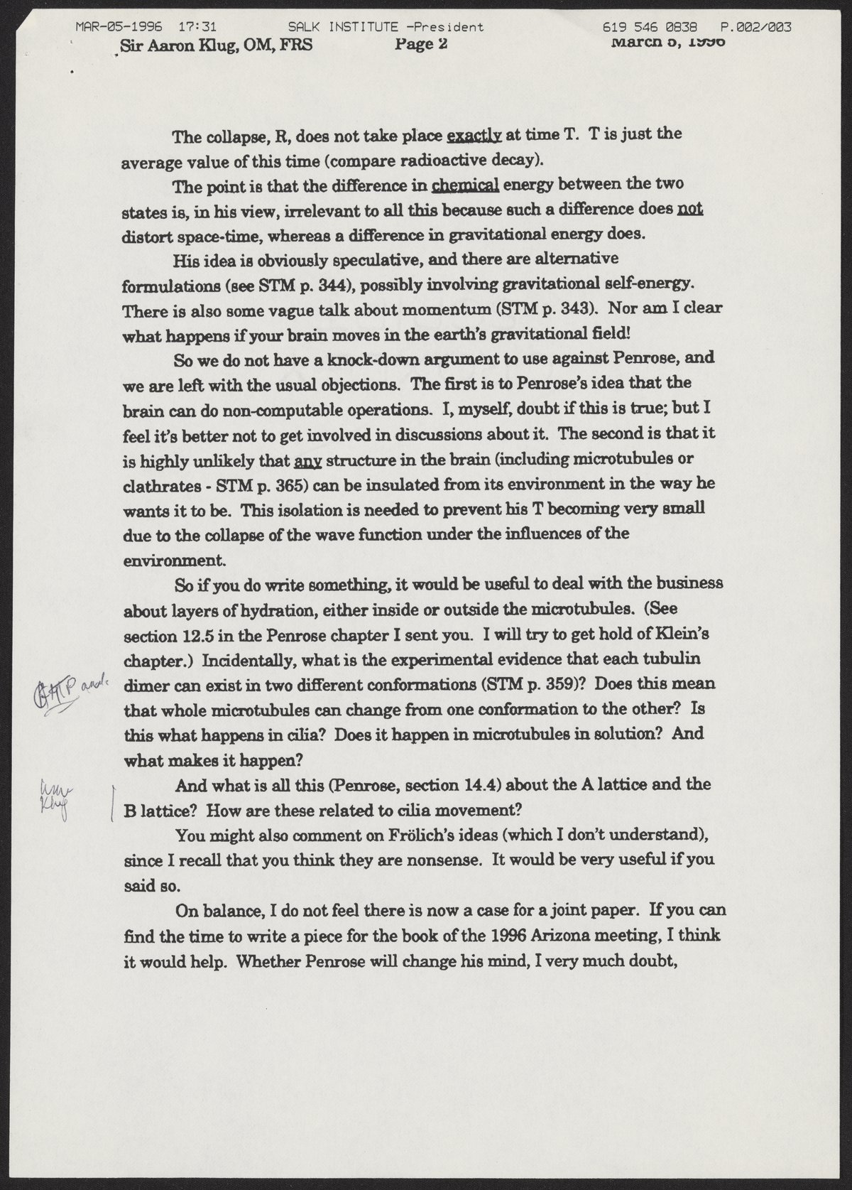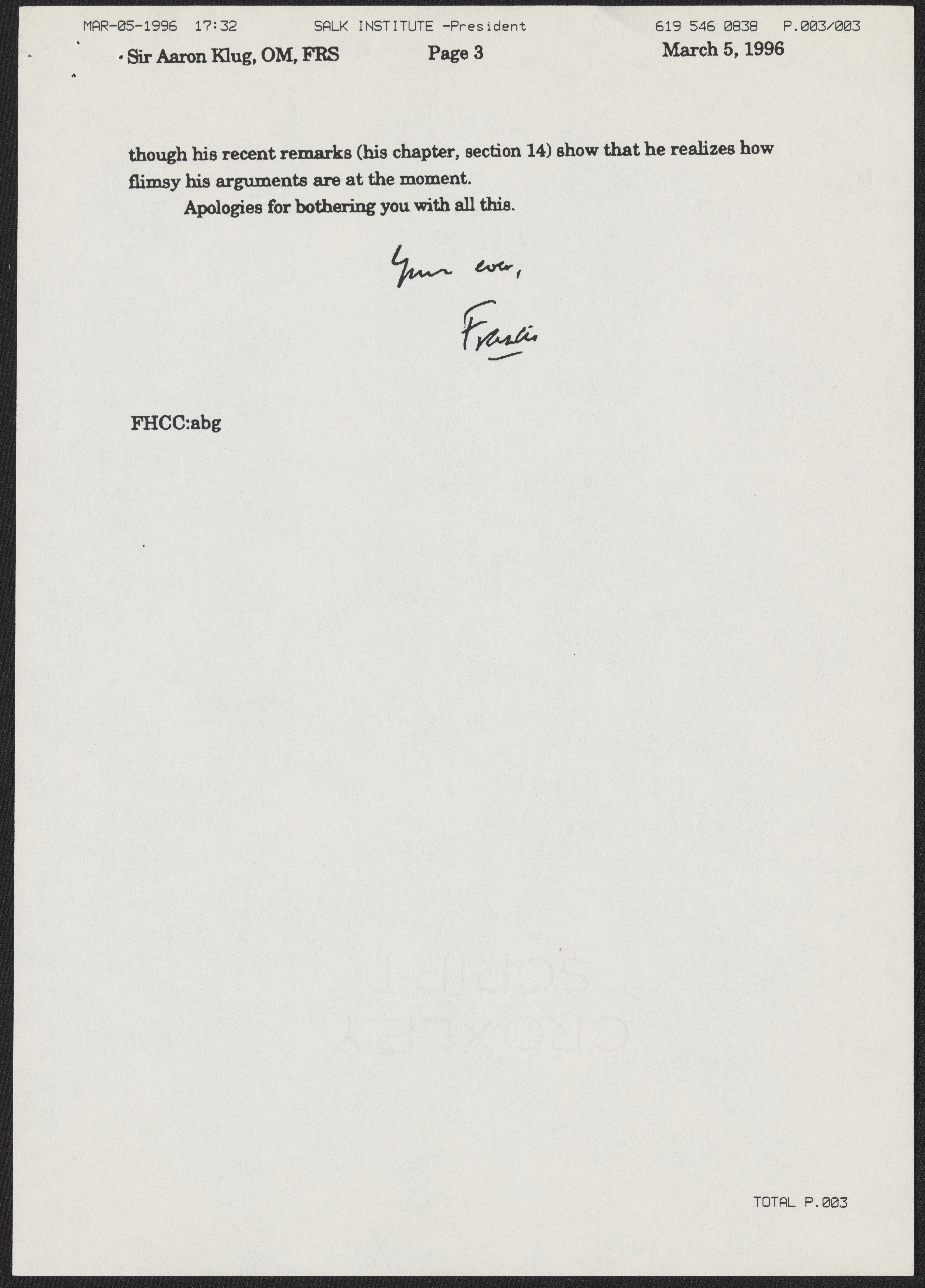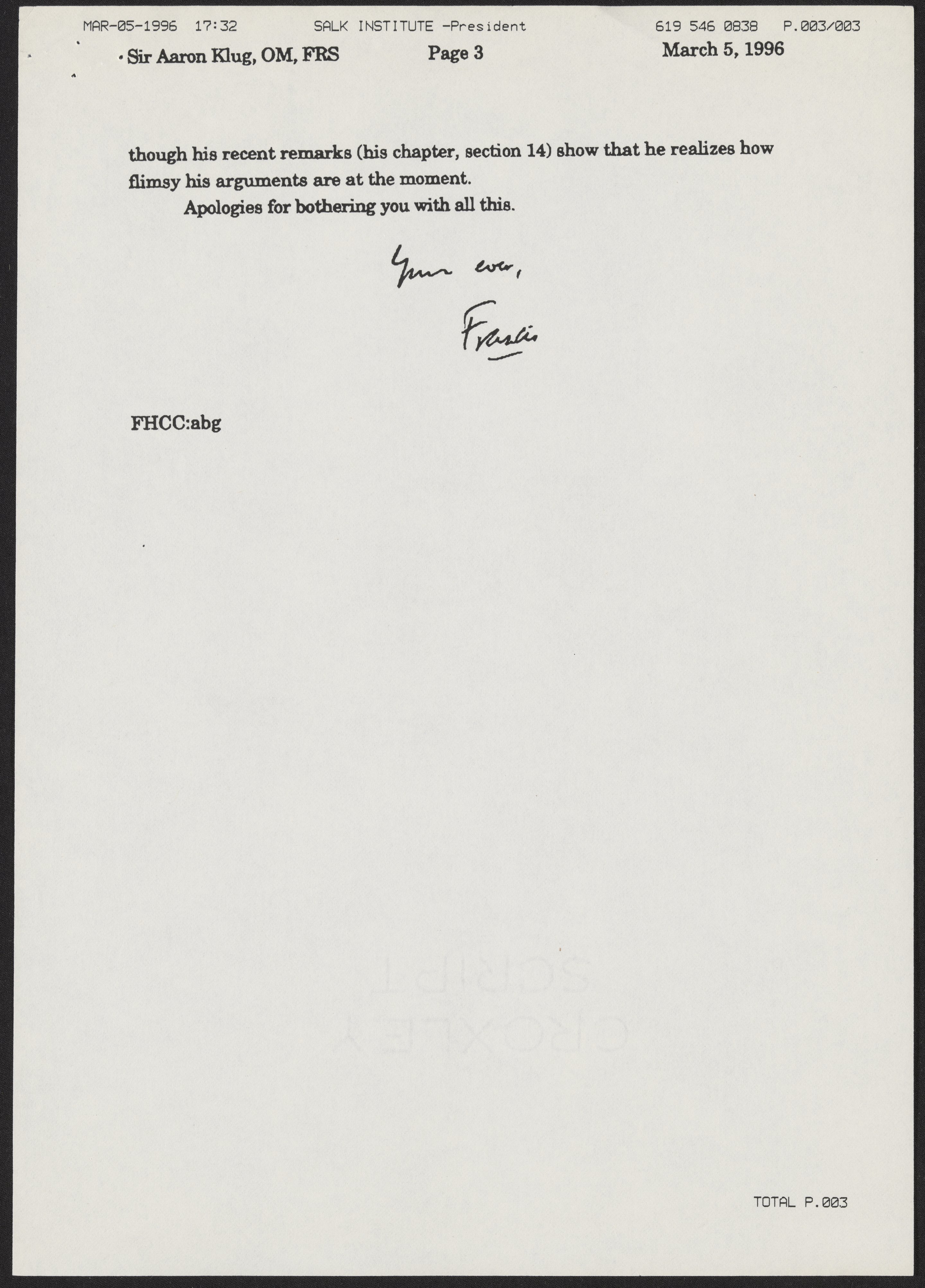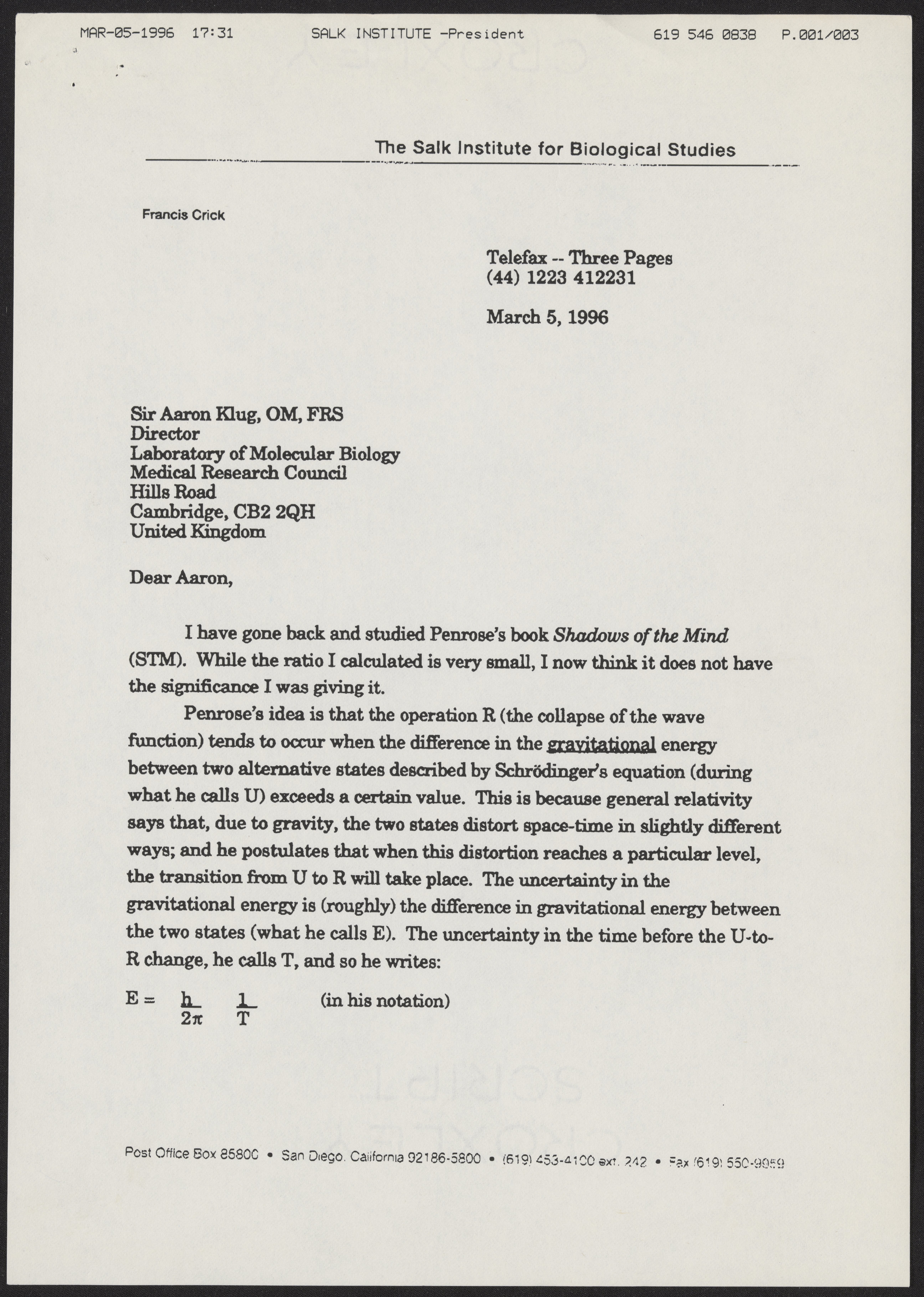 Fax from Francis Crick to Aaron Klug, March 5, 1996