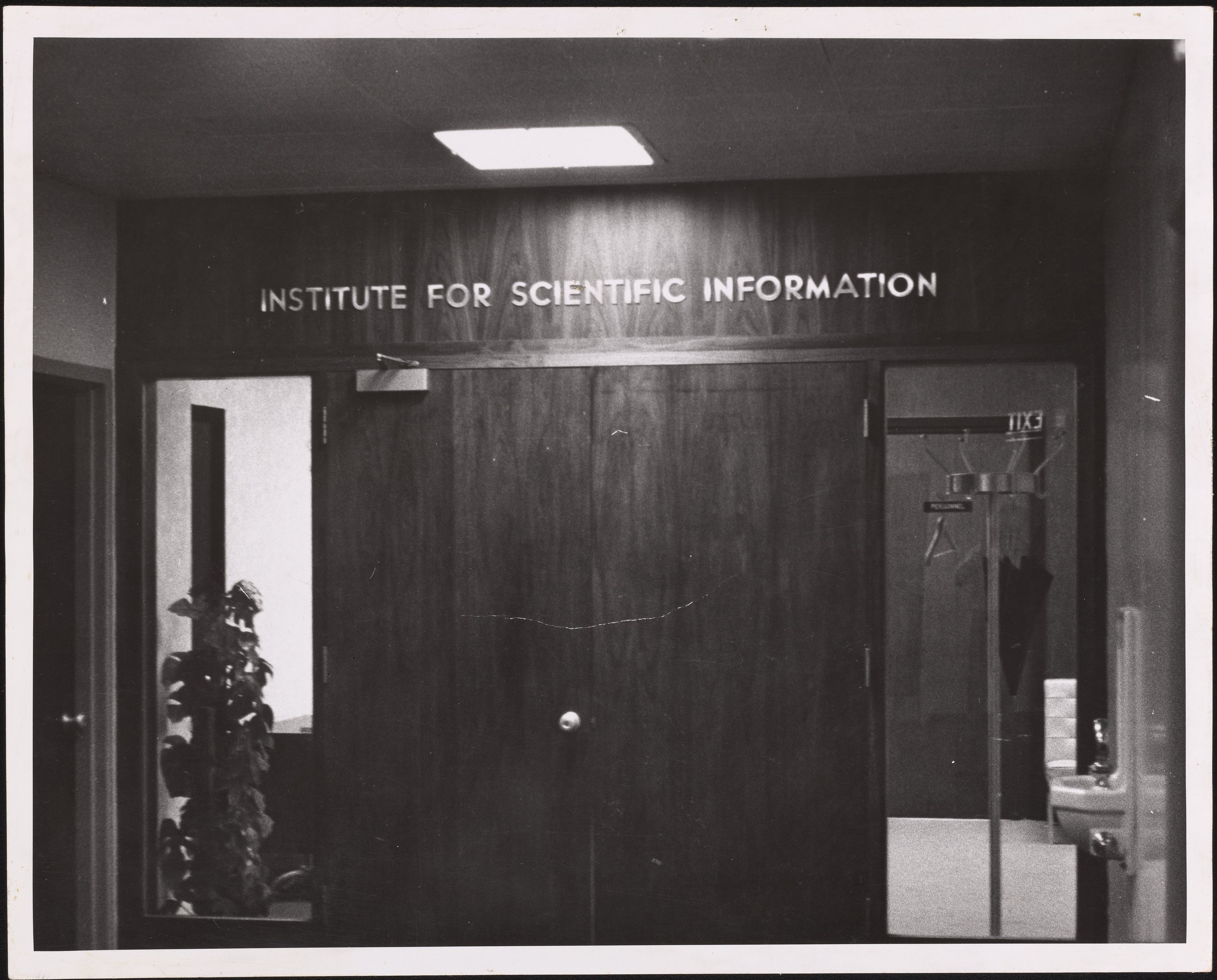 A black and white photograph depicting the fifth-floor entrance to the Institute for Scientific Information (ISI) Chestnut Street office. The ISI was an academic publishing service, founded by Eugene Garfield (1925-2017) in Philadelphia in 1956. ISI offered scientometric and bibliographic database services and specialized in citation indexing and analysis.