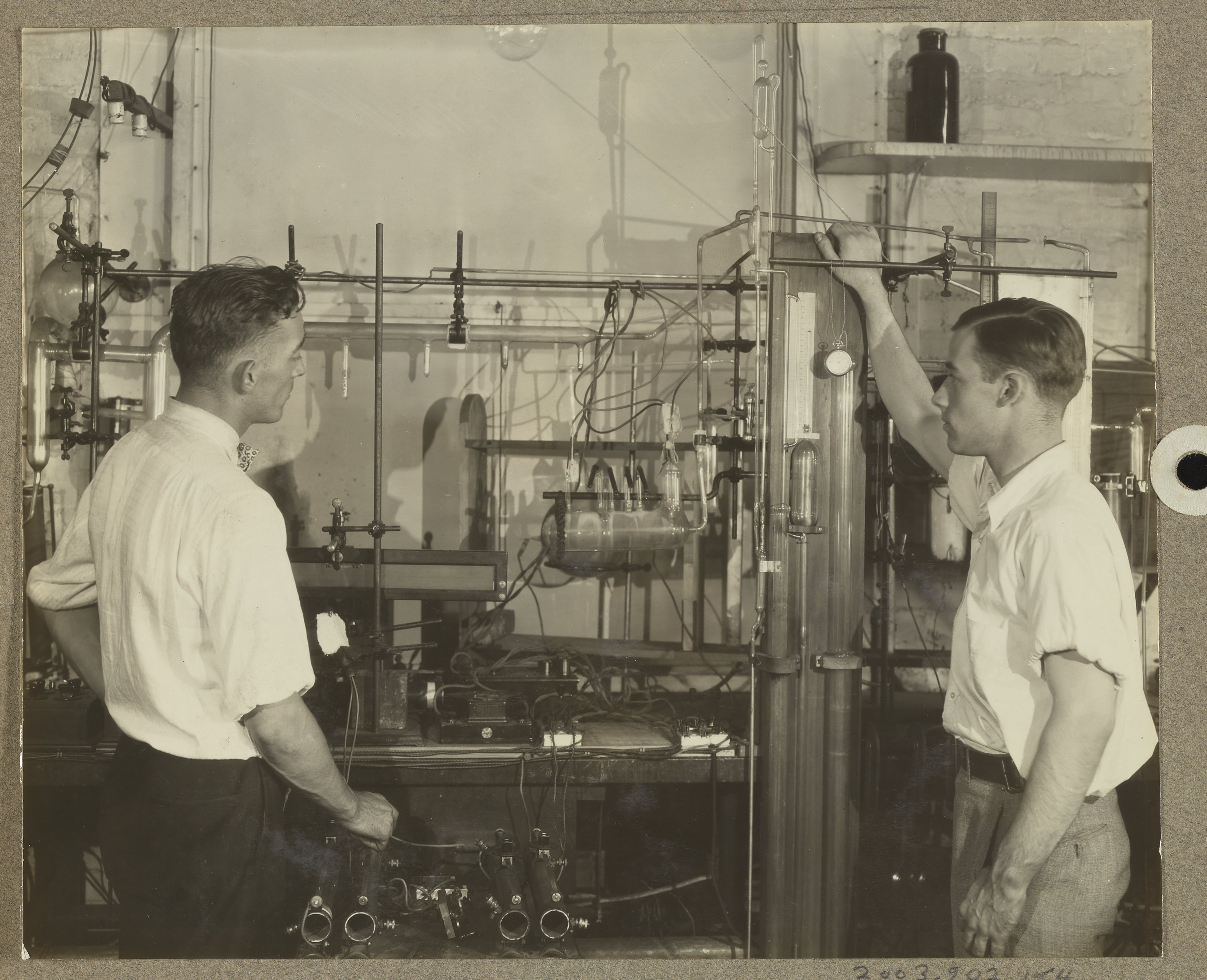 General view of an apparatus used to study the thermal decomposition of ammonia of the surface of tungsten, molybdenum, nickel, and iron catalysts at the U.S. Department of Agriculture's Fixed Nitrogen Research Laboratory located in Washington, D.C. Such experiments are typically conducted in order to discern additional information regarding the role played by catalysts in the ammonia reaction. The individuals present in the photograph are identified as Mr. J.W. Westhaver (left) and Mr. La Mar (right).
