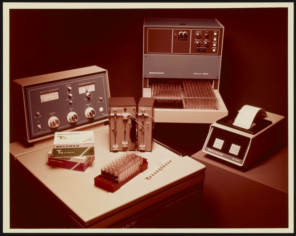 “Beckman Model J-6 Centrifuge, Gamma 4000, DP-5000, and Pipette,” 1990–1999. Beckman Historical Collection, Box 82. Science History Institute. Philadelphia. https://digital.sciencehistory.org/works/js956f94r.
