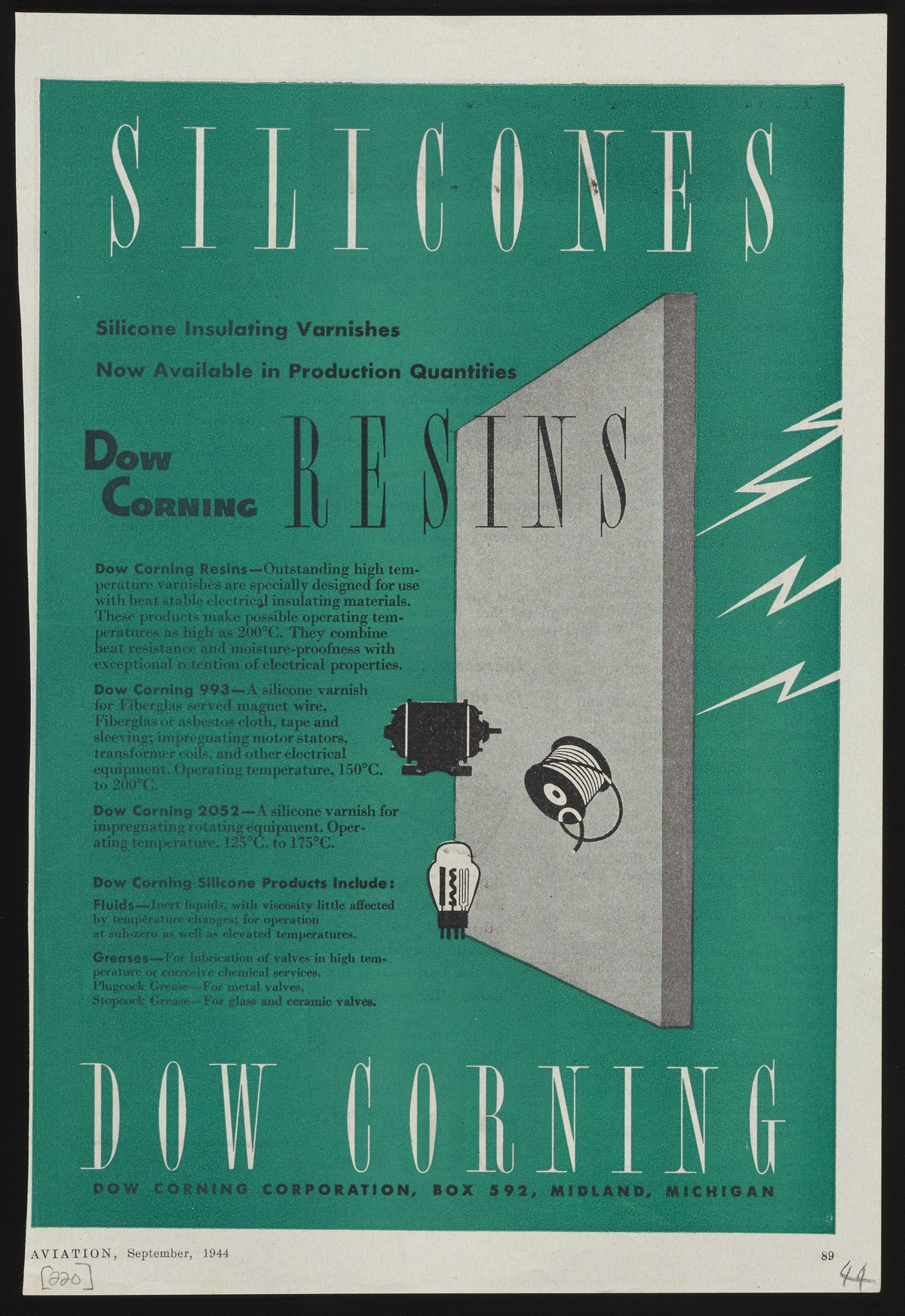 Dow Corning Corporation. “Advertisement for Dow Corning Silicone Insulating Varnishes,” September 1944. Advertisements from the Dow Chemical Historical Collection, Box 7. Science History Institute. Philadelphia. https://digital.sciencehistory.org/works/js956g50w.