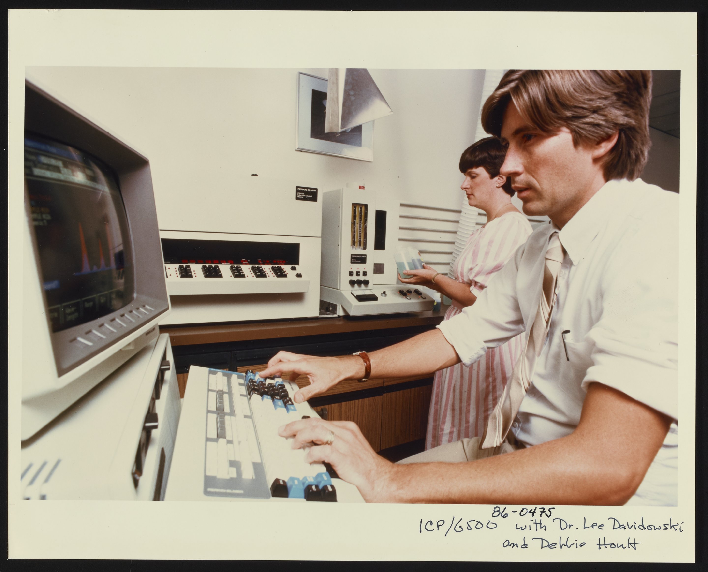 General view of a Perkin-Elmer Model 6500 Inductively Coupled Plasma Mass Spectrometry system in use at an unidentified laboratory facility. The individuals visible in the photograph are identified as Dr. Lee Davidowski and Debbie Hoult.
