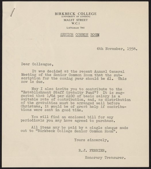 “Letter from R. J. Ferrier to Members of the Senior Common Room and Birkbeck College, November 6, 1958,” November 6, 1958. History of Molecular Biology Collection, Box 17, Folder 12. Science History Institute. Philadelphia. https://digital.sciencehistory.org/works/jsh2rnt.
