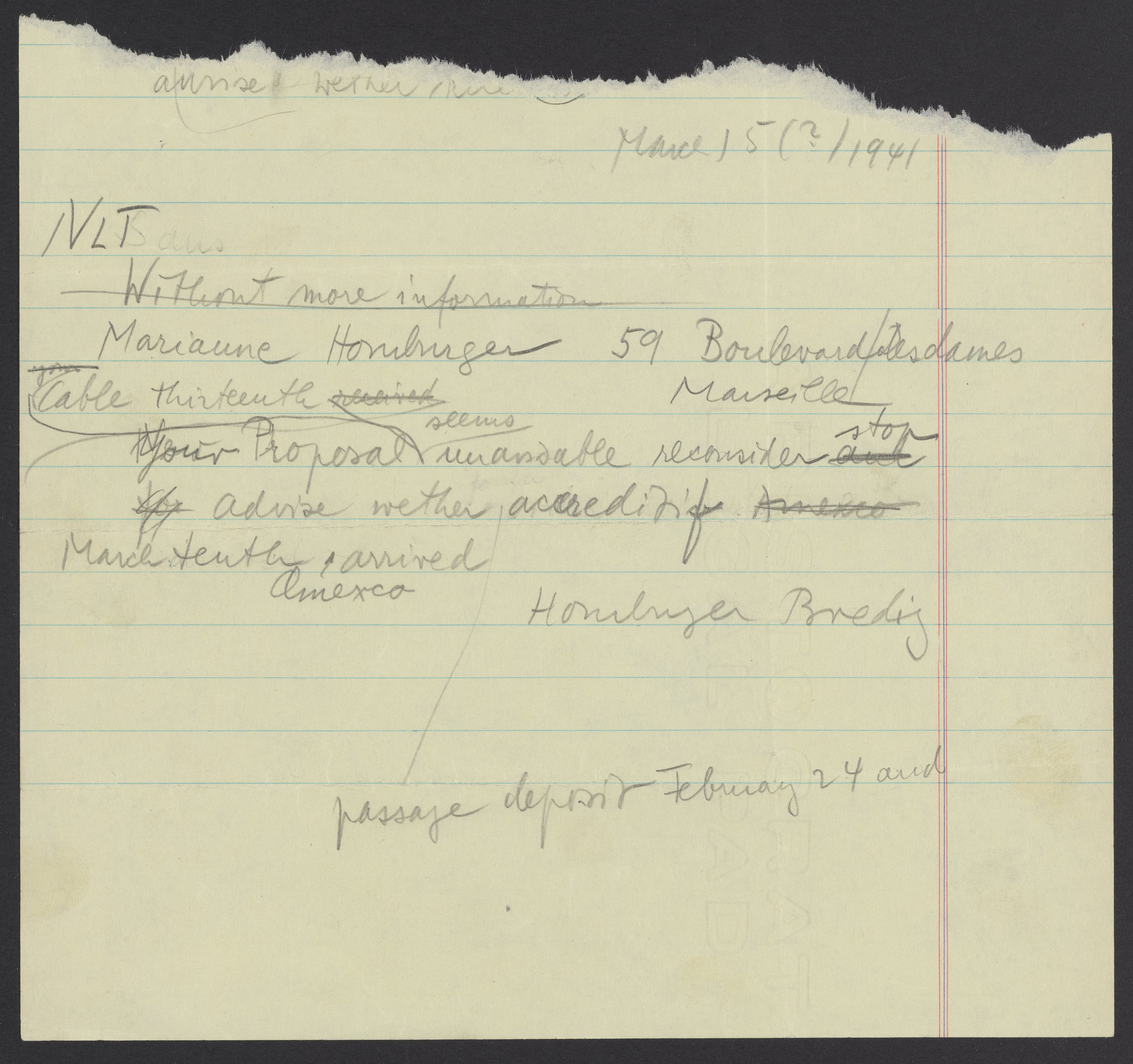 Copy of a telegram from Marianne and Viktor Homburger, March 14, 1941