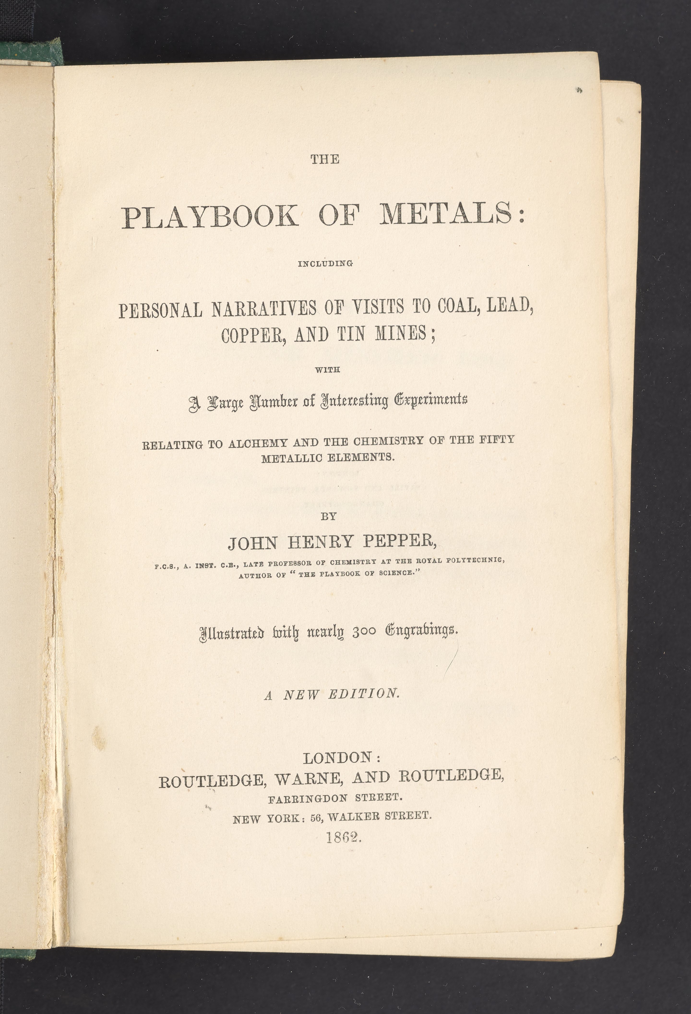 Pepper, John Henry. “The Playbook of Metals : Including Personal Narratives of Visits to Coal, Lead, Copper, and Tin Mines; with a Large Number of Interesting Experiments Relating to Alchemy and the Chemistry of Fifty Metallic Elements.” London, England, 1862. https://digital.sciencehistory.org/works/ju8kttn.