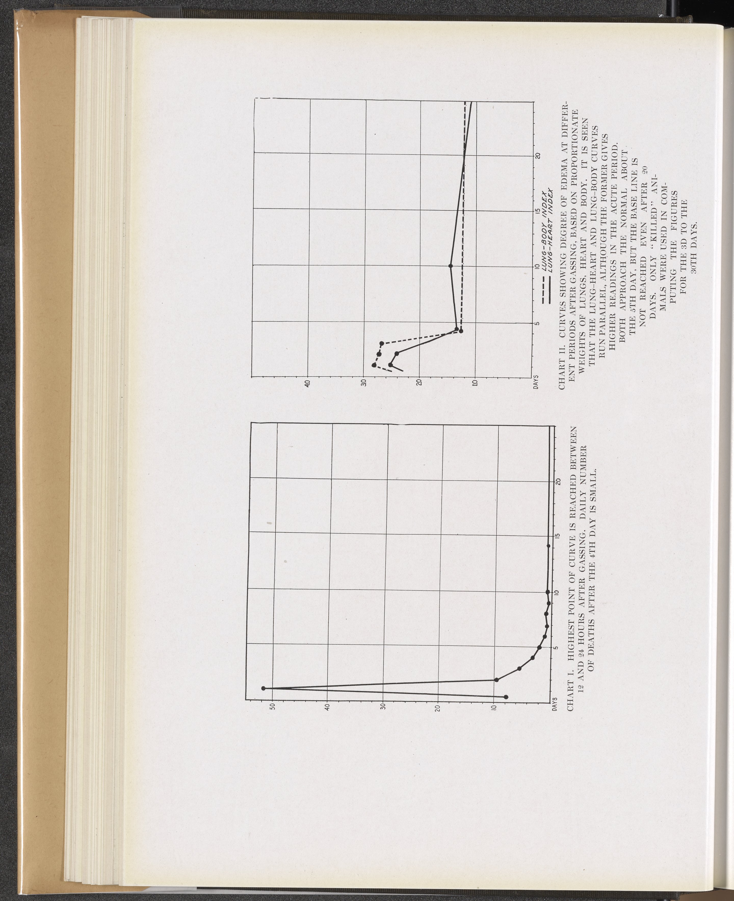 Chart 1: Highest point of curve is reached between 12 and 24 hours after gassing. Chart 2: Curves showing degree of edema at different periods after gassing, based on proportionate weights of lungs, heart, and body.